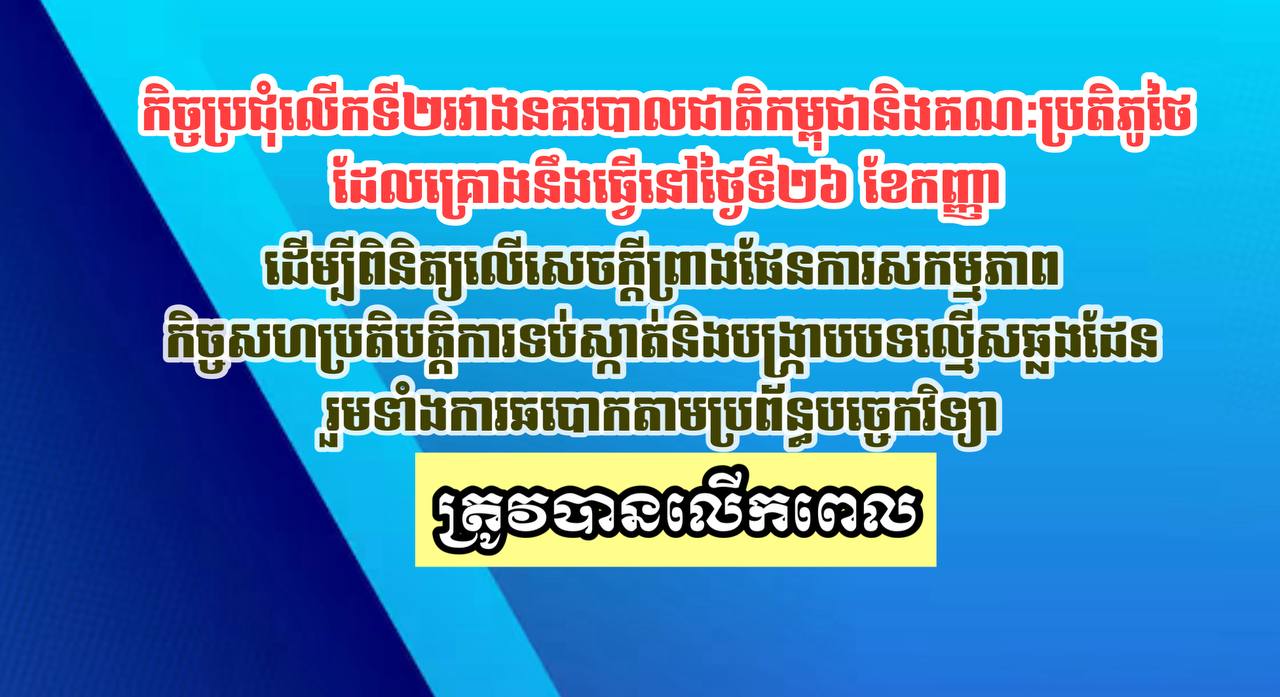កិច្ចប្រជុំលើកទី២រវាងនគរបាលជាតិកម្ពុជានិងគណៈប្រតិភូថៃដែលគ្រោងនឹងធ្វើនៅថ្ងៃទី២៦ ខែកញ្ញា ដើម្បីពិនិត្យលើសេចក្តីព្រាងផែនការសកម្មភាពកិច្ចសហប្រតិបត្តិ្កការទប់ស្កាត់និងបង្ក្រាបបទល្មើសឆ្លងដែនរួមទាំងការឆបោកតាមប្រព័ន្ធបច្ចេកវិទ្យា ត្រូវបានលើកពេល