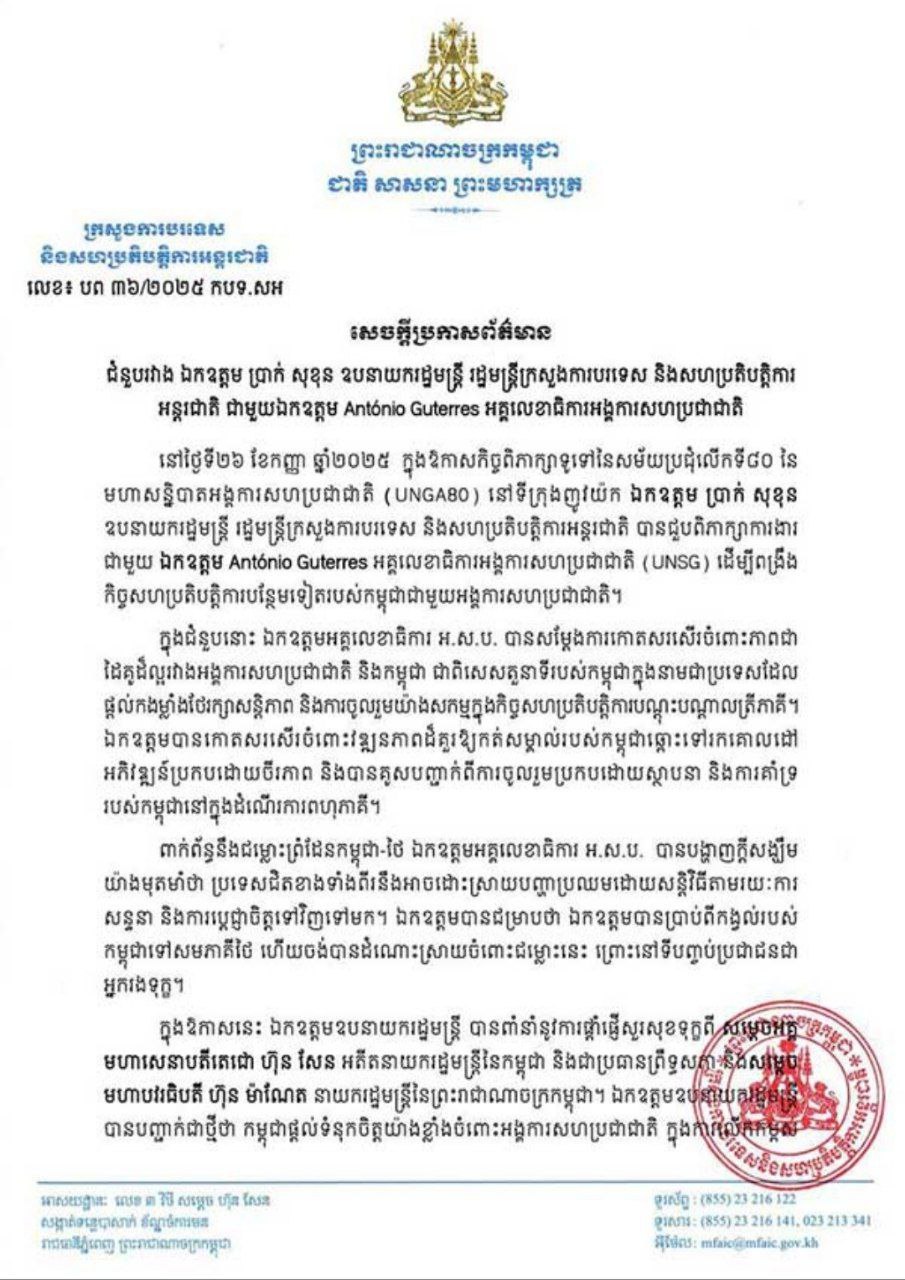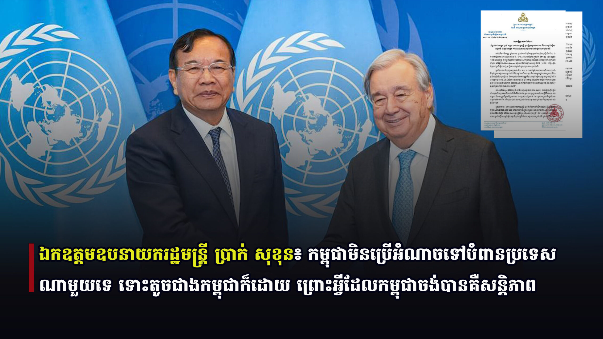 យោងតាមសេចក្តីប្រកាសព័ត៌មានរបស់ក្រសួងការបរទេស និងសហប្រតិបត្តិការអន្តរជាតិ ចុះថ្ងៃ២៩ ខែកញ្ញា ឆ្នាំ២០២៥ បានឱ្យដឹងថា នៅក្នុងជំនួបពិភាក្សាការងារទូទៅនៃកិច្ចប្រជុំលើកទី៨០ នៃមហាសន្និបាតអង្គការសហប្រជាជាតិ (UNGA80) កាលពីថ្ងៃទី២៦ ខែកញ្ញា ឆ្នាំ២០២៥ ជាមួយ ឯកឧត្តម António Guterres អគ្គលេខាធិការអង្គការសហប្រជាជាតិ (UNSG) ឯកឧត្តម ប្រាក់ សុខុន ឧបនាយករដ្ឋមន្ត្រី រដ្ឋមន្ត្រីក្រសួងការបរទេស និងសហប្រតិបត្តិការអន្តរជាតិ បានគូសបញ្ជាក់ថា កម្ពុជាមិនប្រើអំណាចទៅបំពានប្រទេសណាមួយទេ ទោះតូចជាងកម្ពុជាក៏ដោយ ព្រោះអ្វីដែលកម្ពុជាចង់បានគឺសន្តិភាព ។ កម្ពុជាបានឆ្លងកាត់សង្គ្រាមបីទសវត្សរ៍ រួចមកហើយ និងសោកនាដកម្មអំពើប្រល័យពូជសាសន៍។ ដូច្នេះ យើងបានយល់ច្បាស់ពីសង្គ្រាម ហើយអ្វីដែលយើងចង់បាន គឺសន្តិភាព។