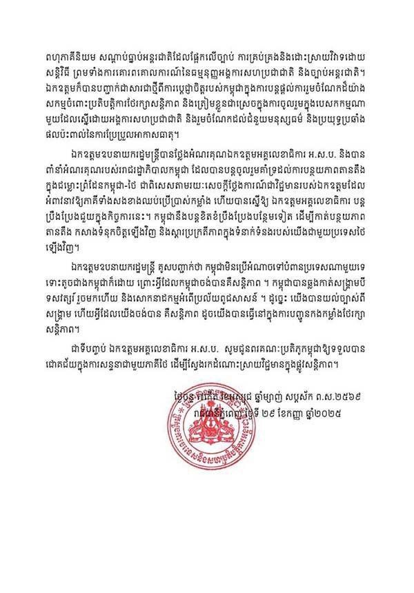 ជាមួយគ្នានោះផងដែរ ឯកឧត្តមឧបនាយករដ្ឋមន្ត្រី ប្រាក់ សុខុន បានថ្លែងអំណរគុណឯកឧត្តមអគ្គលេខាធិការ អ.ស.ប. និងបានពាំនាំអំណរគុណរបស់ររាជរដ្ឋាភិបាលកម្ពុជា ដែលបានបន្តចូលរួមគាំទ្រដល់ការបន្ថយភាពតានតឹងក្នុងជម្លោះព្រំដែនកម្ពុជា-ថៃ ជាពិសេសតាមរយៈសេចក្ដីថ្លែងការណ៍ជាវិជ្ជមានរបស់ឯកឧត្តមដែលអំពាវនាវឱ្យភាគីទាំងសងខាងឈប់ប្រើប្រាស់កម្លាំង ហើយបានស្នើឱ្យឯកឧត្តមអគ្គលេខាធិការបន្តប្រឹងប្រែងជួយក្នុងកិច្ចការនេះ។ កម្ពុជានឹងបន្តខិតខំប្រឹងប្រែងបន្ថែមទៀត ដើម្បីកាត់បន្ថយភាពតានតឹង កសាងទំនុកចិត្តឡើងវិញ និងស្តារប្រក្រតីភាពក្នុងទំនាក់ទំនងរបស់យើងជាមួយប្រទេសថៃឡើងវិញ៕