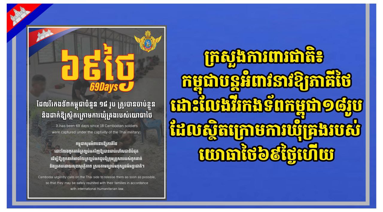 It has been 69days since 18 Cambodian soldiers were captured under the captivity of the Thai military. Cambodia urgently calls on the Thai side to release them as soon as possible, so that they may be safely reunited with their families in accordance with international humanitarian law.