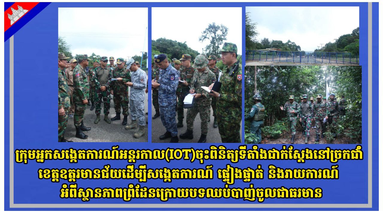 ក្រុមអ្នកសង្កេតការណ៍អន្តរកាល(IOT)ចុះពិនិត្យទីតាំងជាក់ស្តែង នៅច្រកជាំ ខេត្តឧត្តរមានជ័យដើម្បីសង្កេតការណ៍ ផ្ទៀងផ្ទាត់ និងរាយការណ៍អំពីស្ថានភាពព្រំដែនក្រោយបទឈប់បាញ់ចូលជាធរមាន