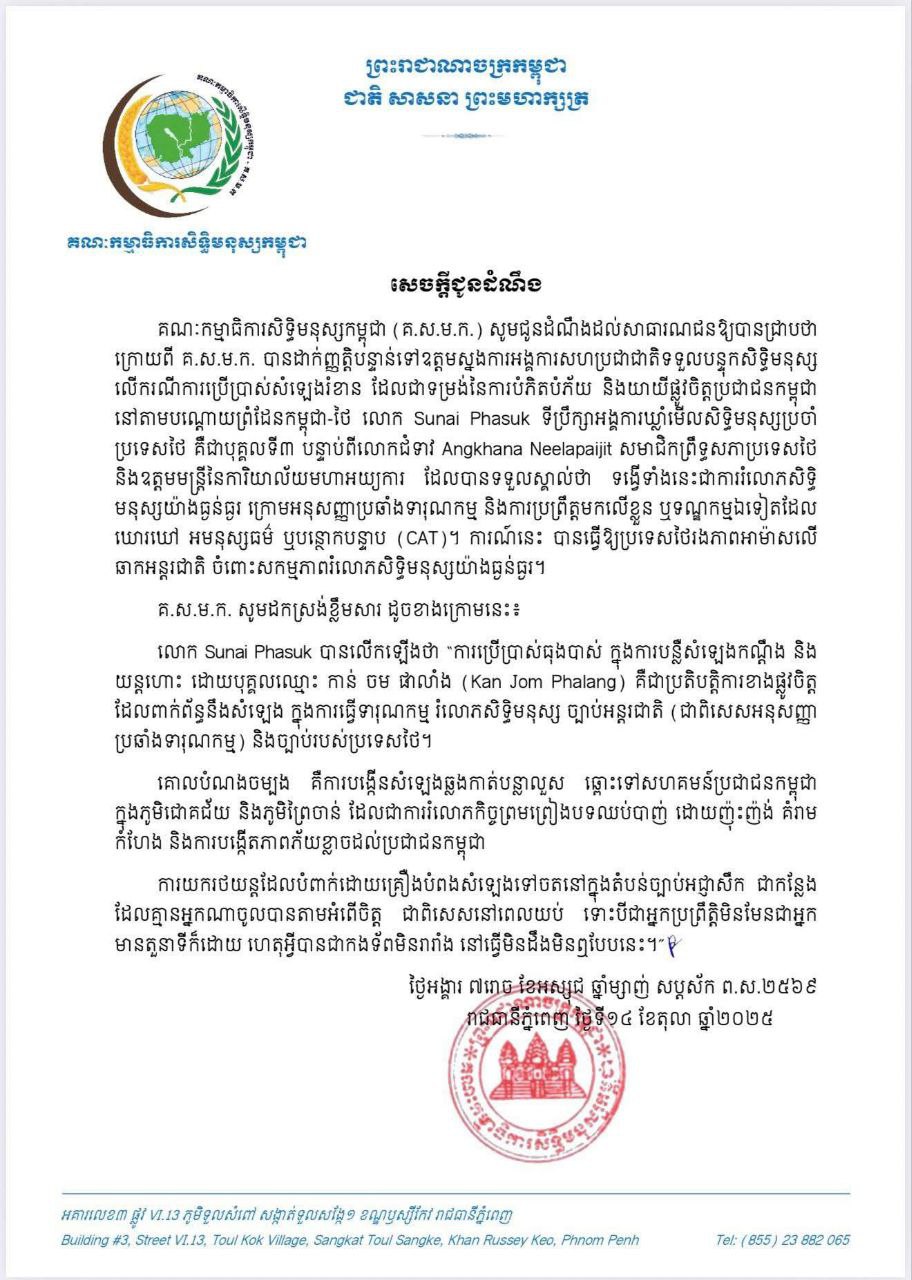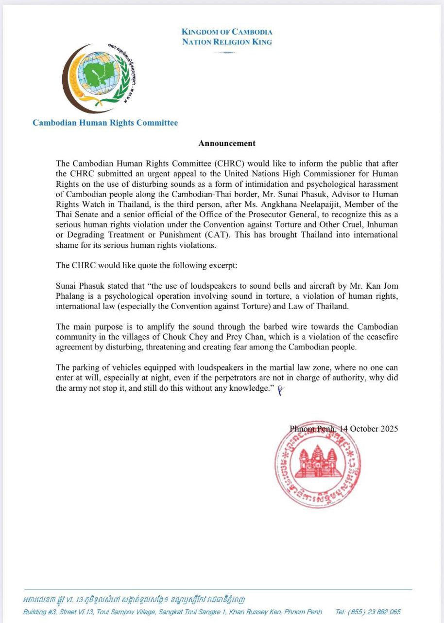 នៅថ្ងៃទី១៤ ខែតុលា ឆ្នាំ២០២៥ គណៈកម្មាធិការសិទ្ធិមនុស្សកម្ពុជា (គ.ស.ម.ក.) បានចេញសេចក្តីជូនដំណឹងថា ក្រោយពី គ.ស.ម.ក. បានដាក់ញ្ញត្តិបន្ទាន់ទៅឧត្ដមស្នងការអង្គការសហប្រជាជាតិទទួលបន្ទុកសិទ្ធិមនុស្សលើករណីការប្រើប្រាស់សំឡេងរំខាន ដែលជាទម្រង់នៃការបំភិតបំភ័យ និងយាយីផ្លូវចិត្តប្រជាជនកម្ពុជានៅតាមបណ្ដោយព្រំដែនកម្ពុជា-ថៃ លោក Sunai Phasuk ទីប្រឹក្សាអង្គការឃ្លាំមើលសិទ្ធិមនុស្សប្រចាំប្រទេសថៃ គឺជាបុគ្គលទី៣ បន្ទាប់ពីលោកជំទាវ AngkhanaNeelapaijit សមាជិកព្រឹទ្ធសភាប្រទេសថៃ