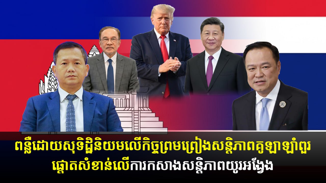 មជ្ឈដ្ឋានជាតិ និងអន្តរជាតិ បាននិងកំពុងចាប់អារម្មណ៍យ៉ាងយកចិត្តទុកដាក់ និងដោយសុទិដ្ឋិនិយមបំផុត អំពីការបញ្ចប់សង្រ្គាមរយៈពេលប្រាំថ្ងៃរវាងកម្ពុជា-ថៃថ្មីៗនេះ ដែលភាគីទាំងពីរ ទើបបានជួបចរចាគ្នាក្នុងកិច្ចសម្របសម្រួលចតុភាគី នៅទីក្រុង កូឡាឡាំពួរ ប្រទេសម៉ាឡេស៊ីដែលនឹងឈានដល់ការចុះហត្ថលេខាលើកិច្ចព្រមព្រៀងសន្តិភាពមួយ ជាមួយនឹងវត្តមានរបស់លោក ដូណាល់ ត្រាំ ក្នុងឱកាសនៃជំនួបកំពូលអាស៊ាន ក្នុងសប្តាហ៍នេះ។