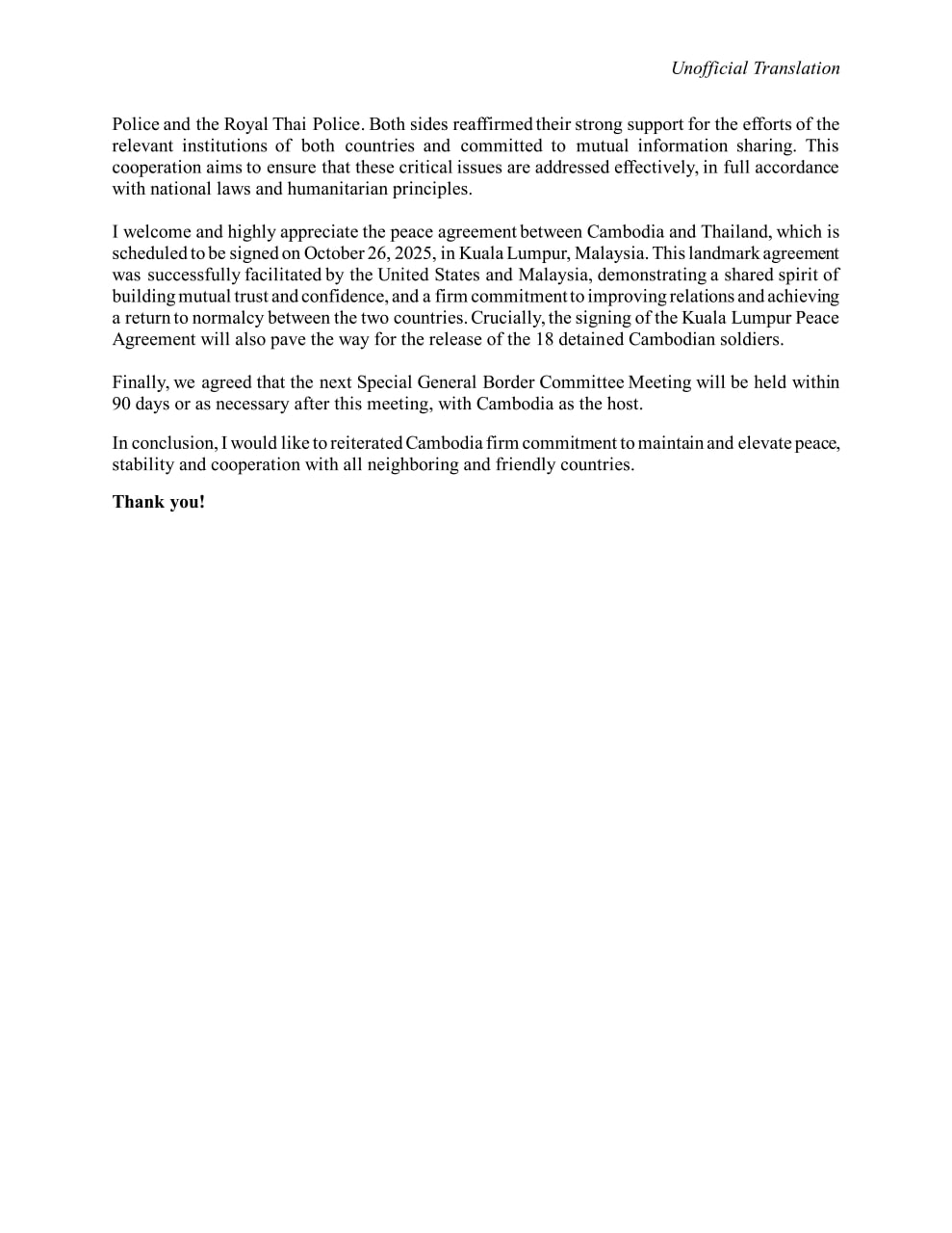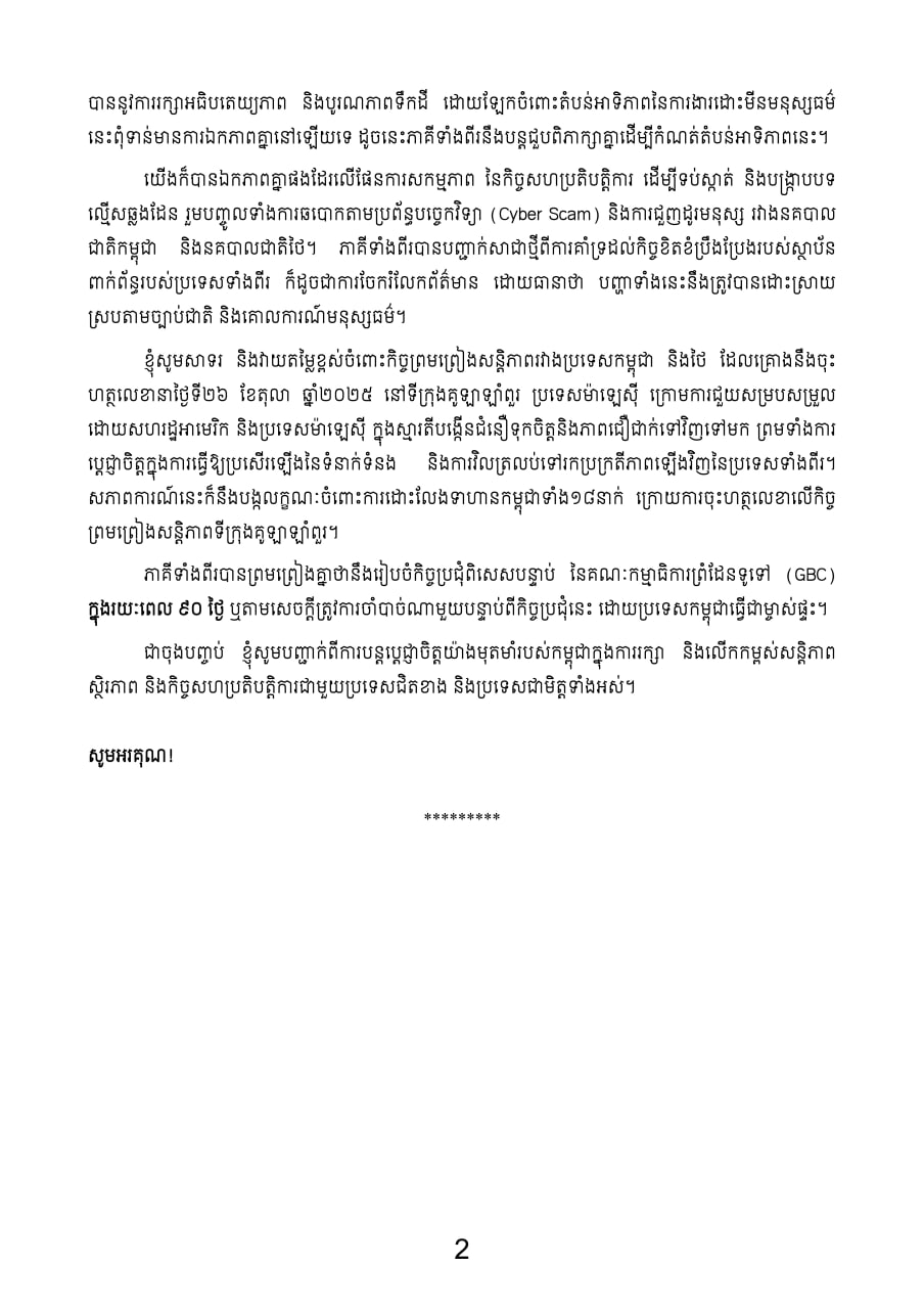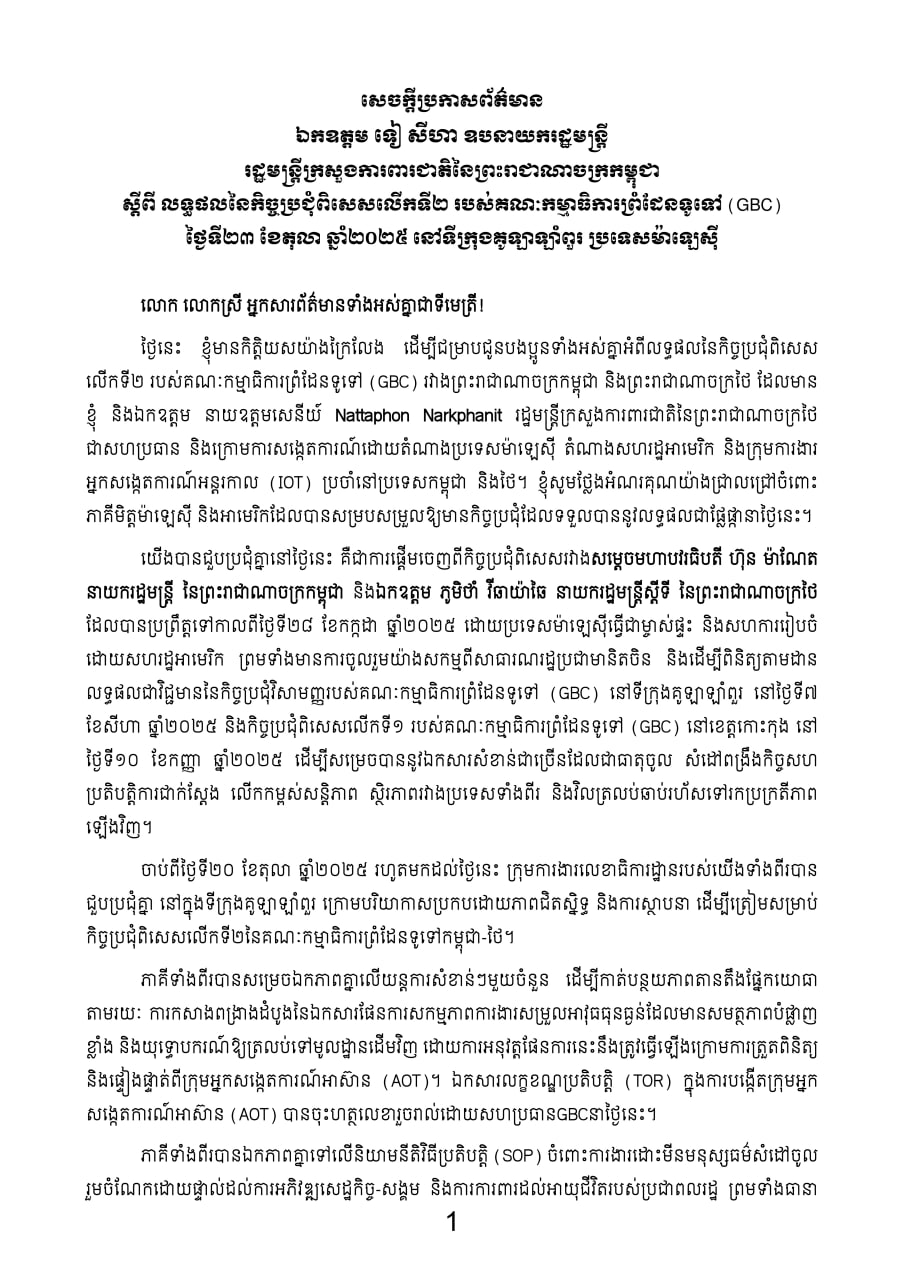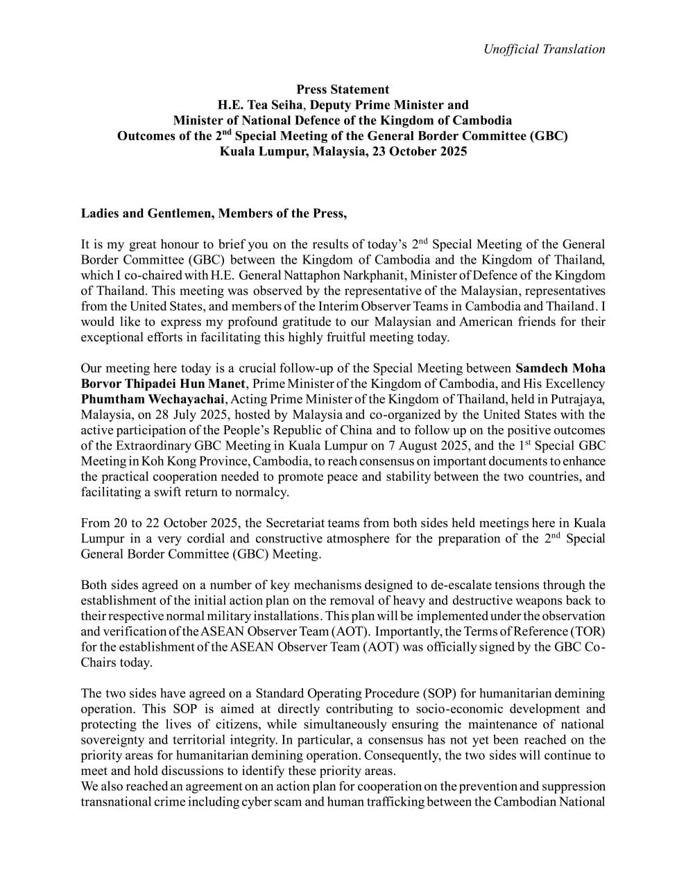 យោងតាមសេចក្តីប្រកាសព័ត៌មានរបស់ ឯកឧត្តម ទៀ សីហា ឧបនាយករដ្ឋមន្តី រដ្ឋមន្ត្រីក្រសួងការពារជាតិកម្ពុជា នៅថ្ងៃទី២៣ ខែតុលា ឆ្នាំ២០២៥ បានឱ្យដឹងថា លទ្ធផលនៃកិច្ចប្រជុំពិសេសលើកទី២ របស់គណៈកម្មាធិការព្រំដែនទូទៅ (GBC) នៅថ្ងៃនេះ នៅទីក្រុងគូឡាឡាំពួរ ប្រទេសម៉ាឡេស៊ី ដែលមានវត្តមានចូលរួមពី ឯកឧត្តមនាយឧត្ដមសេនីយ៍ Nattaphon Narkphanit រដ្ឋមន្ត្រីក្រសួងការពារជាតិនៃព្រះរាជាណាចក្រថៃជាសហប្រធាន និងក្រោមការសង្កេតការណ៍ដោយតំណាងប្រទេសម៉ាឡេស៊ី តំណាងសហរដ្ឋអាមេរិក និងក្រុមការងារអ្នកសង្កេតការណ៍អន្តរកាល (IOT) ប្រចាំនៅប្រទេសកម្ពុជា និងថៃ។