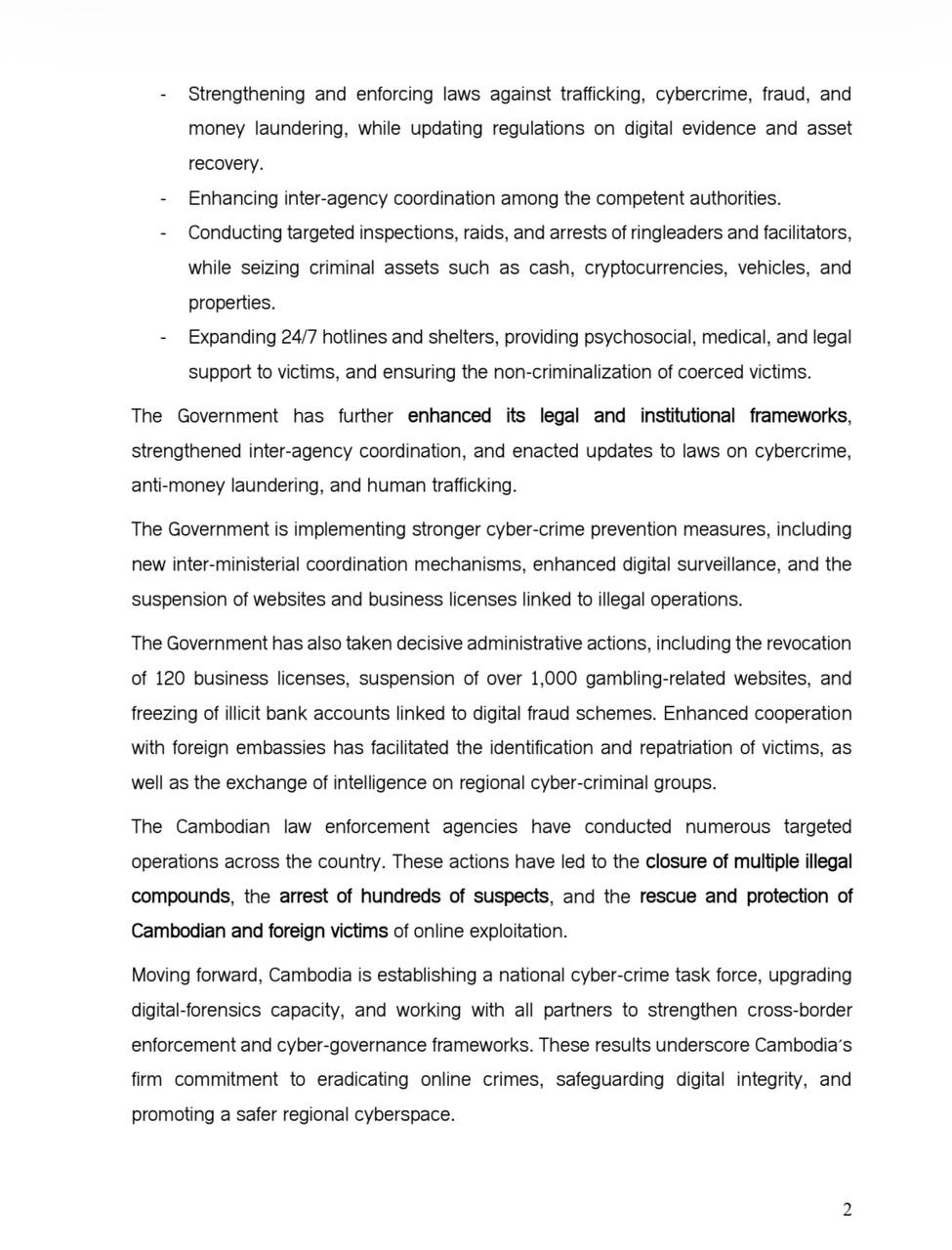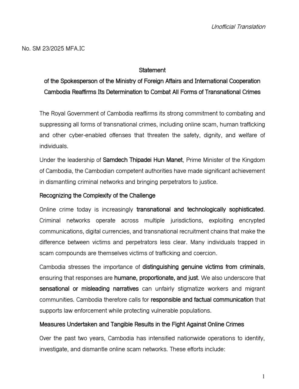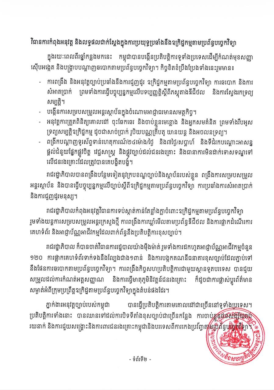 យោងតាមសេចក្តីថ្លែងការណ៍របស់ក្រសួងការបរទេសនិងសហប្រតិបត្តិការអន្តរជាតិ ចុះថ្ងៃទី២៣ ខែតុលា ឆ្នាំ២០២៥ បានឱ្យដឹងថា រាជរដ្ឋាភិបាលកម្ពុជា បានបញ្ជាក់ជាថ្មីពីការប្តេជ្ញាចិត្តយ៉ាងមុតមាំក្នុងការប្រយុទ្ធប្រឆាំង និងបង្រ្កាបឧក្រិដ្ឋកម្មឆ្លងដែនគ្រប់ទម្រង់រួមទាំងការឆបោកតាមប្រព័ន្ធបច្ចេកវិទ្យា ការជួញដូរមនុស្សនិងបទល្មើសតាមប្រព័ន្ធបច្ចេកវិទ្យាផ្សេងទៀតដែលគំរាមកំហែងដល់សុវត្ថិភាព សេចក្តីថ្លៃថ្នូរ និងសុខុមាលភាពបុគ្គល។