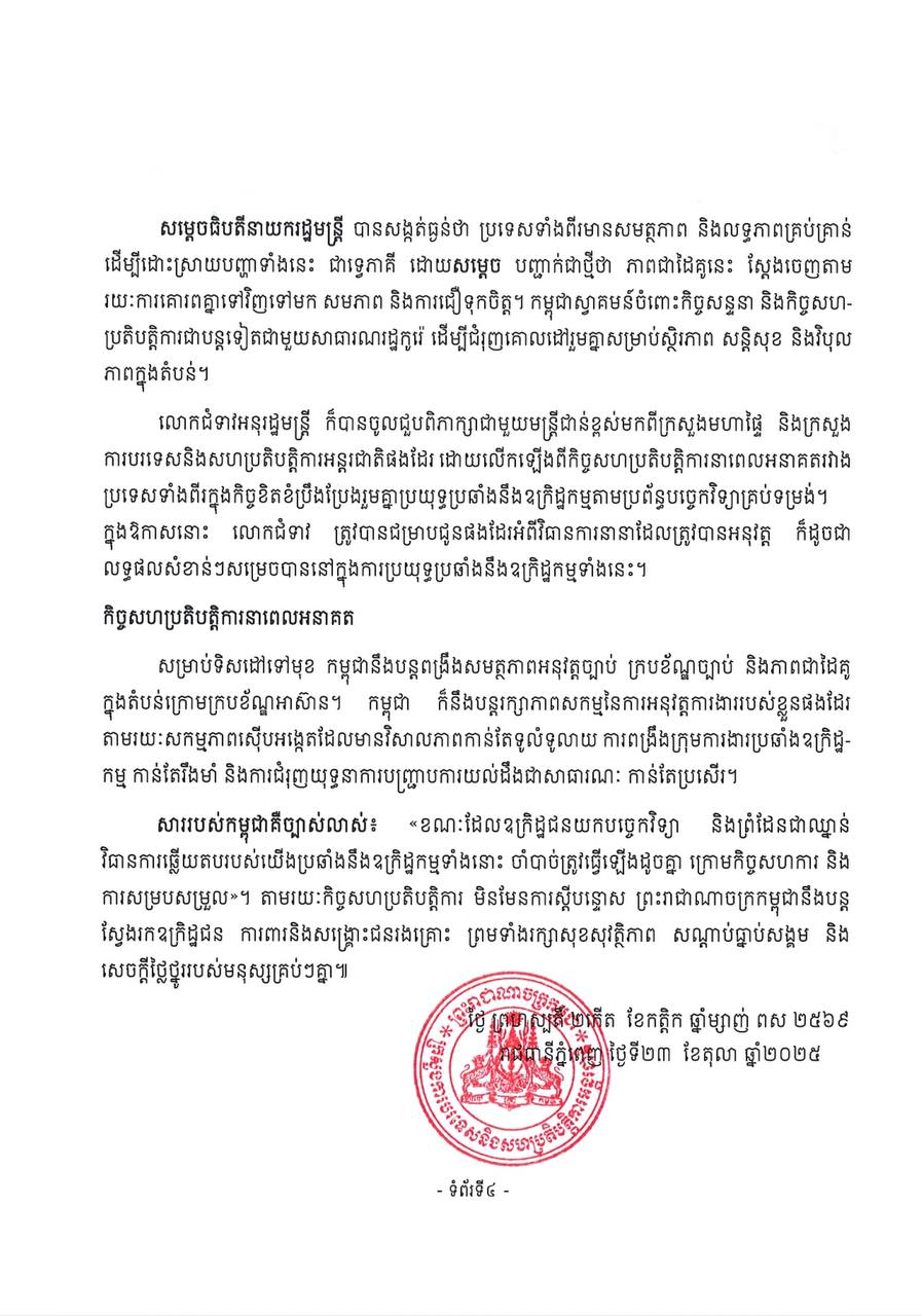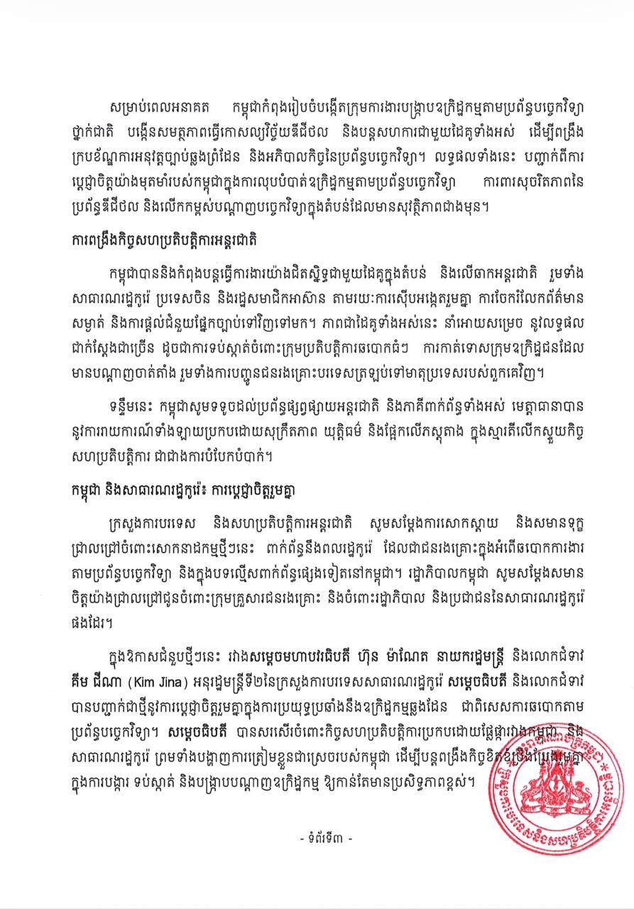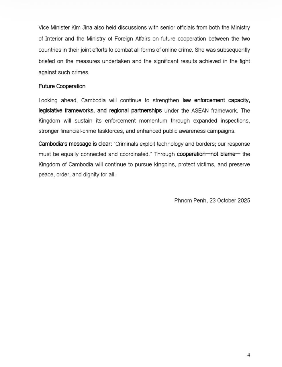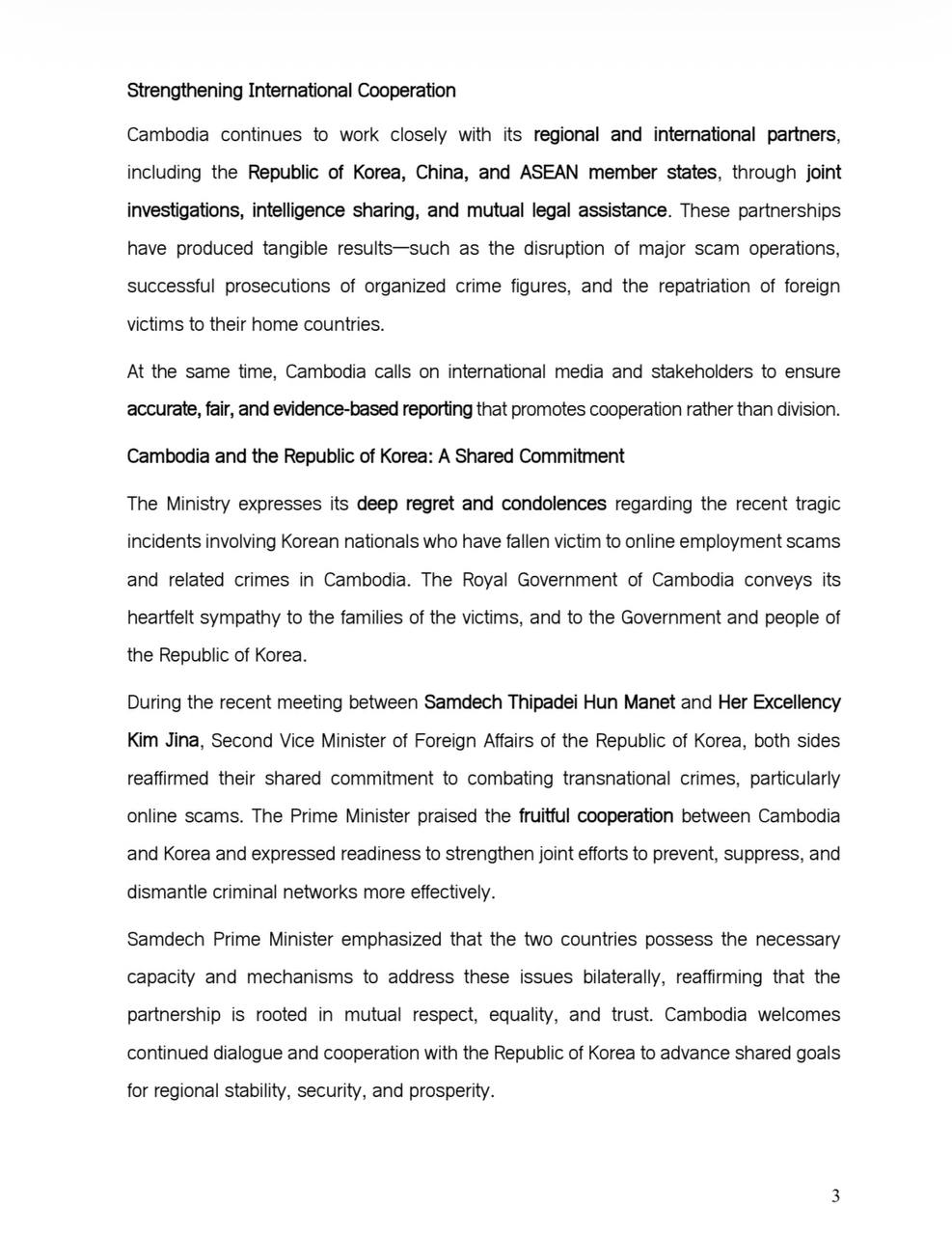 យោងតាមសេចក្តីថ្លែងការណ៍របស់ក្រសួងការបរទេសនិងសហប្រតិបត្តិការអន្តរជាតិ ចុះថ្ងៃទី២៣ ខែតុលា ឆ្នាំ២០២៥ បានឱ្យដឹងថា រាជរដ្ឋាភិបាលកម្ពុជា បានបញ្ជាក់ជាថ្មីពីការប្តេជ្ញាចិត្តយ៉ាងមុតមាំក្នុងការប្រយុទ្ធប្រឆាំង និងបង្រ្កាបឧក្រិដ្ឋកម្មឆ្លងដែនគ្រប់ទម្រង់រួមទាំងការឆបោកតាមប្រព័ន្ធបច្ចេកវិទ្យា ការជួញដូរមនុស្សនិងបទល្មើសតាមប្រព័ន្ធបច្ចេកវិទ្យាផ្សេងទៀតដែលគំរាមកំហែងដល់សុវត្ថិភាព សេចក្តីថ្លៃថ្នូរ និងសុខុមាលភាពបុគ្គល។