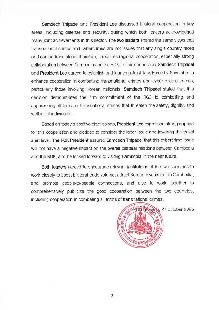 នៅក្នុងជំនួបនោះផងដែរ សម្តេចធិបតី និងប្រធានាធិបតី Lee ក៏បានឯកភាពគ្នាបង្កើត និងដាក់ឱ្យដំណើរការក្រុមការងារចម្រុះមួយនៅខែវិច្ឆិកា ដើម្បីបង្កើនកិច្ចសហប្រតិបត្តិការក្នុងការប្រយុទ្ធប្រឆាំងឧក្រិដ្ឋកម្មឆ្លងដែន និងឧក្រិដ្ឋកម្មនានាដែលពាក់ព័ន្ធនឹងសាយប័រ ជាពិសេសពាក់ព័ន្ធនឹងជនជាតិកូរ៉េ។ ការសម្រេចចិត្តនេះ បង្ហាញពីការប្តេជ្ញាចិត្តយ៉ាងមុតមាំរបស់រាជរដ្ឋាភិបាលកម្ពុជា ក្នុងការប្រយុទ្ធប្រឆាំង និងបង្ក្រាប ឧក្រិដ្ឋកម្មឆ្លងដែនគ្រប់ទម្រង់ ដែលគំរាមកំហែងដល់សុវត្ថិភាព សេចក្តីថ្លៃថ្នូរ និងសុខុមាលភាពបុគ្គល។ ទន្ទឹមនោះផងដែរ ឯកឧត្តមប្រធានាធិបតីសាធារណៈរដ្ឋកូរ៉េ ក៏បានធានាចំពោះសម្តេចធិបតីផងដែរថា បញ្ហាឧក្រិដ្ឋកម្មសាយប័រនេះនឹងមិនជះឥទ្ធិពលអវិជ្ជមានដល់ទំនាក់ទំនងទ្វេភាគីជារួមរវាងកម្ពុជានិងសាធារណៈរដ្ឋកូរ៉េទេ ហើយឯកឧត្តមនឹងទន្ទឹងរង់ចាំបំពេញទស្សនកិច្ចនៅកម្ពុជា នាពេលខាងមុខ។