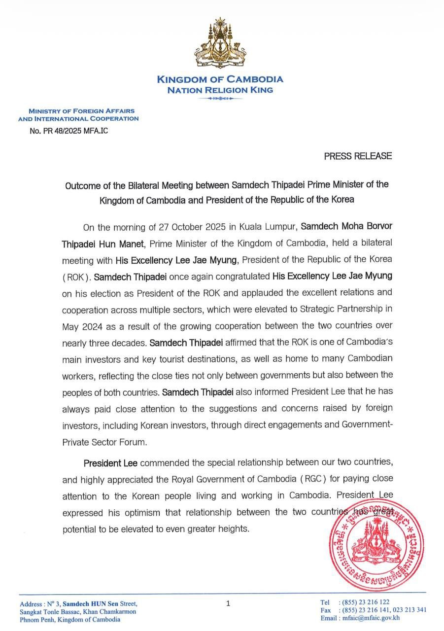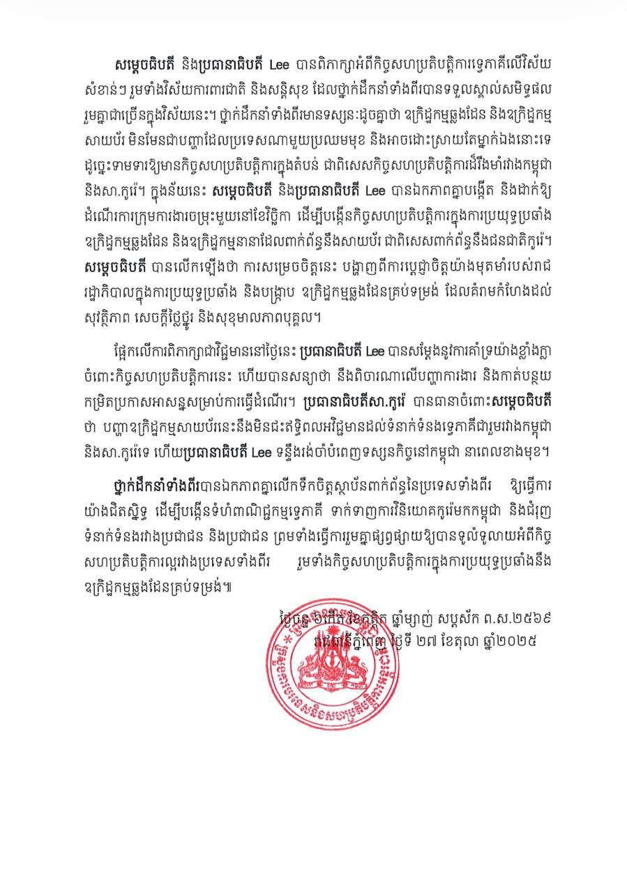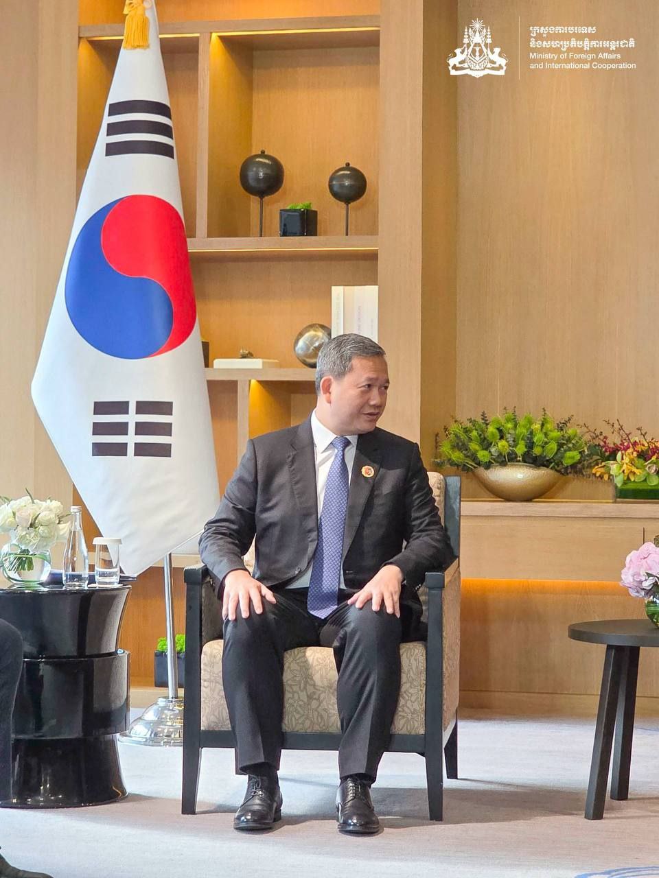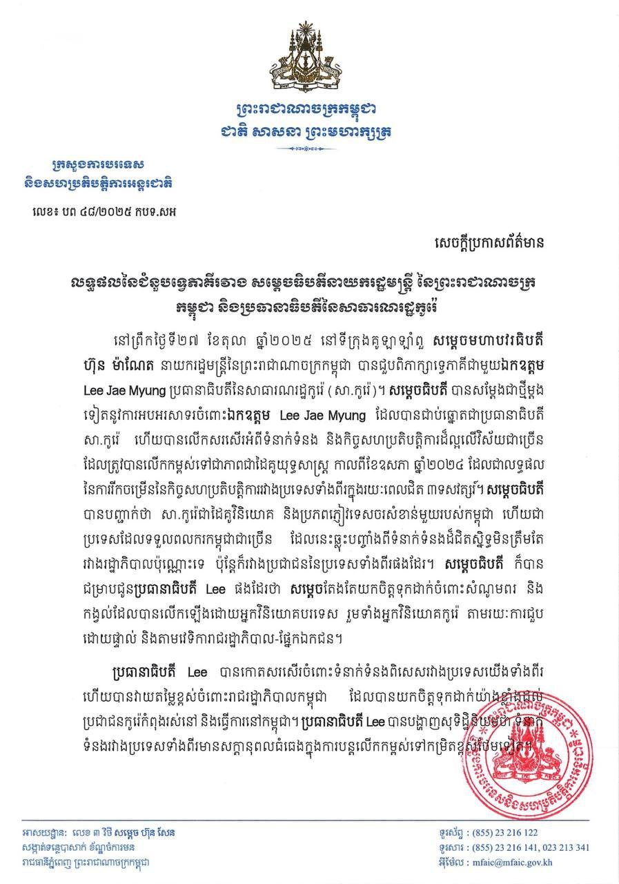 យោងសេចក្តីប្រកាសព័ត៌មានរបស់ក្រសួងការបរទេសនិងកិច្ចសហប្រតិបត្តិការអន្តរជាតិ នៅថ្ងៃទី២៧ ខែតុលា ឆ្នាំ២០២៥ បានឱ្យដឹងថា សម្តេចធិបតី ហ៊ុន ម៉ាណែត នាយករដ្ឋមន្ត្រីកម្ពុជាអញ្ជើញជួបពិភាក្សាការងារជាមួយឯកឧត្តម Lee Jae Myung ប្រធានាធិបតីនៃសាធារណរដ្ឋកូរ៉េ អំពីកិច្ចសហប្រតិបត្តិការទ្វេភាគីលើវិស័យសំខាន់ៗ រួមទាំងវិស័យការពារជាតិ និងសន្តិសុខ ដែលថ្នាក់ដឹកនាំទាំងពីរបានទទួលស្គាល់សមិទ្ធផលរួមគ្នាជាច្រើនក្នុងវិស័យនេះ។