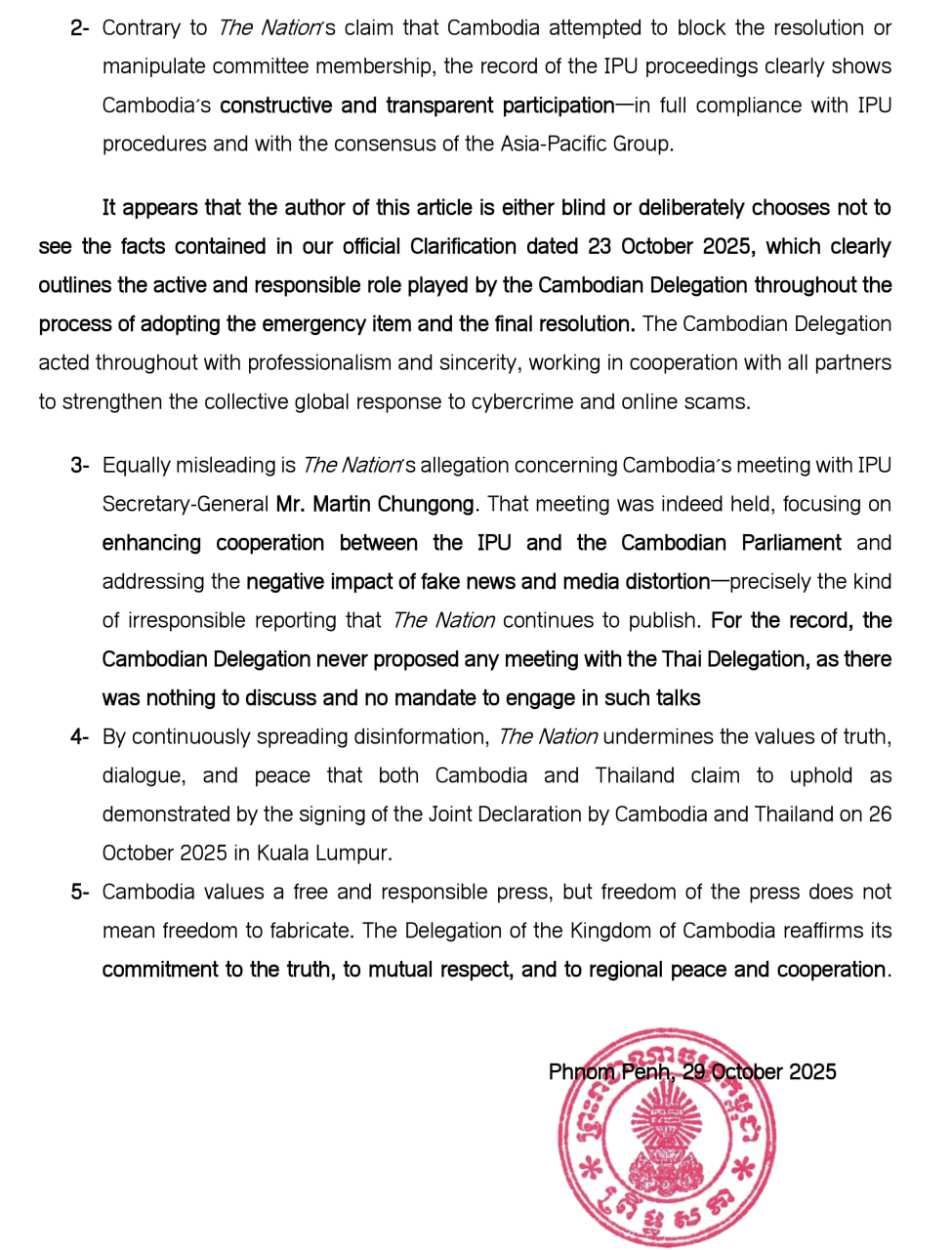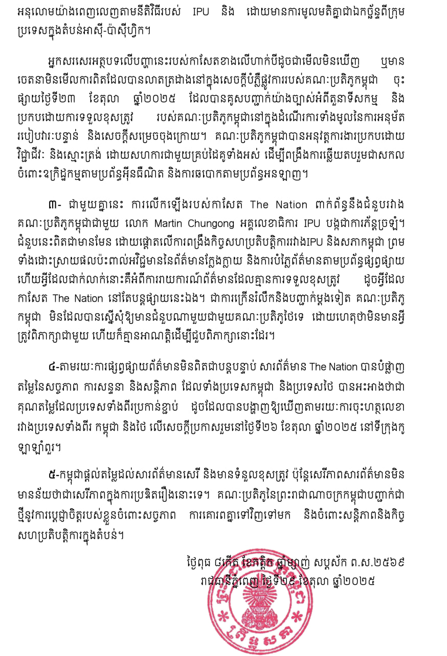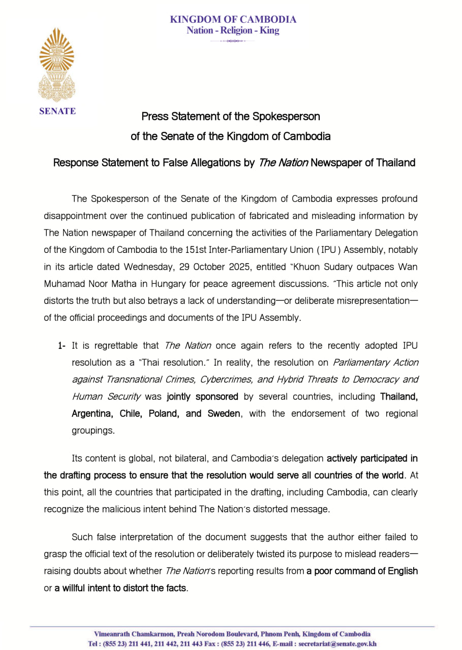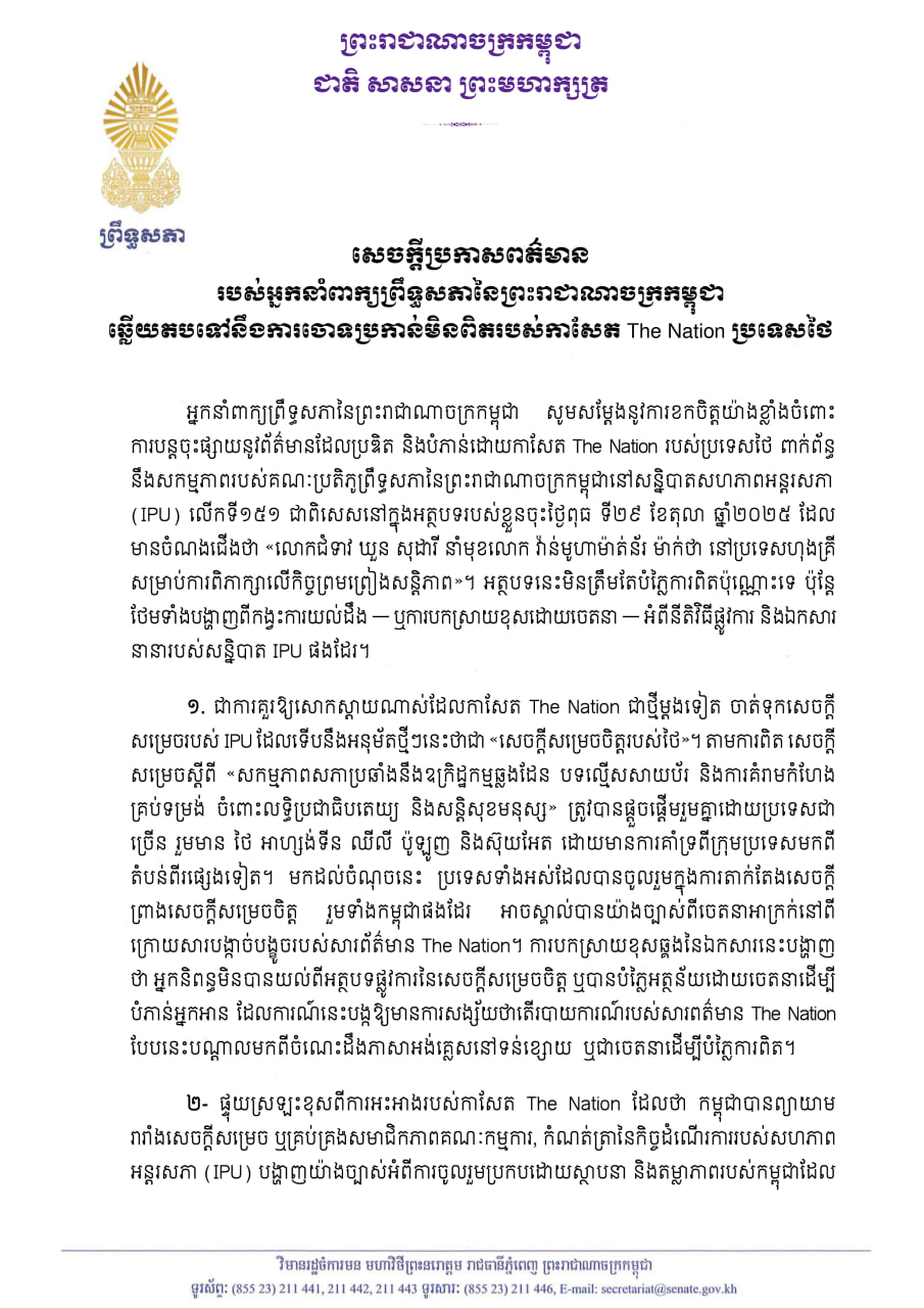 អ្នកនាំពាក្យព្រឹទ្ធសភានៃព្រះរាជាណាចក្រកម្ពុជានៅថ្ងៃទី២៩ ខែតុលា ឆ្នាំ២០២៥ បានចេញសេចក្តីប្រកាសពត៌មានឆ្លើយតបទៅនឹងការចោទប្រកាន់មិនពិតរបស់កាសែត The Nation ប្រទេសថៃ ពាក់ព័ន្ធនឹងសកម្មភាពរបស់គណៈប្រតិភូព្រឹទ្ធសភានៃព្រះរាជាណាចក្រកម្ពុជា នៅសន្និបាតសហភាពអន្តរសភា (IPU) លើកទី១៥១ ជាពិសេសនៅក្នុងអត្ថបទរបស់ខ្លួនចុះថ្ងៃពុធ ទី២៩ ខែតុលា ឆ្នាំ២០២៥ ដែល មានចំណងជើងថា «លោកជំទាវ ឃួន សុដារី នាំមុខលោក វ៉ាន់មូហាម៉ាត់ន័រ ម៉ាក់ថា នៅប្រទេសហុងគ្រី សម្រាប់ការពិភាក្សាលើកិច្ចព្រមព្រៀងសន្តិភាព»។