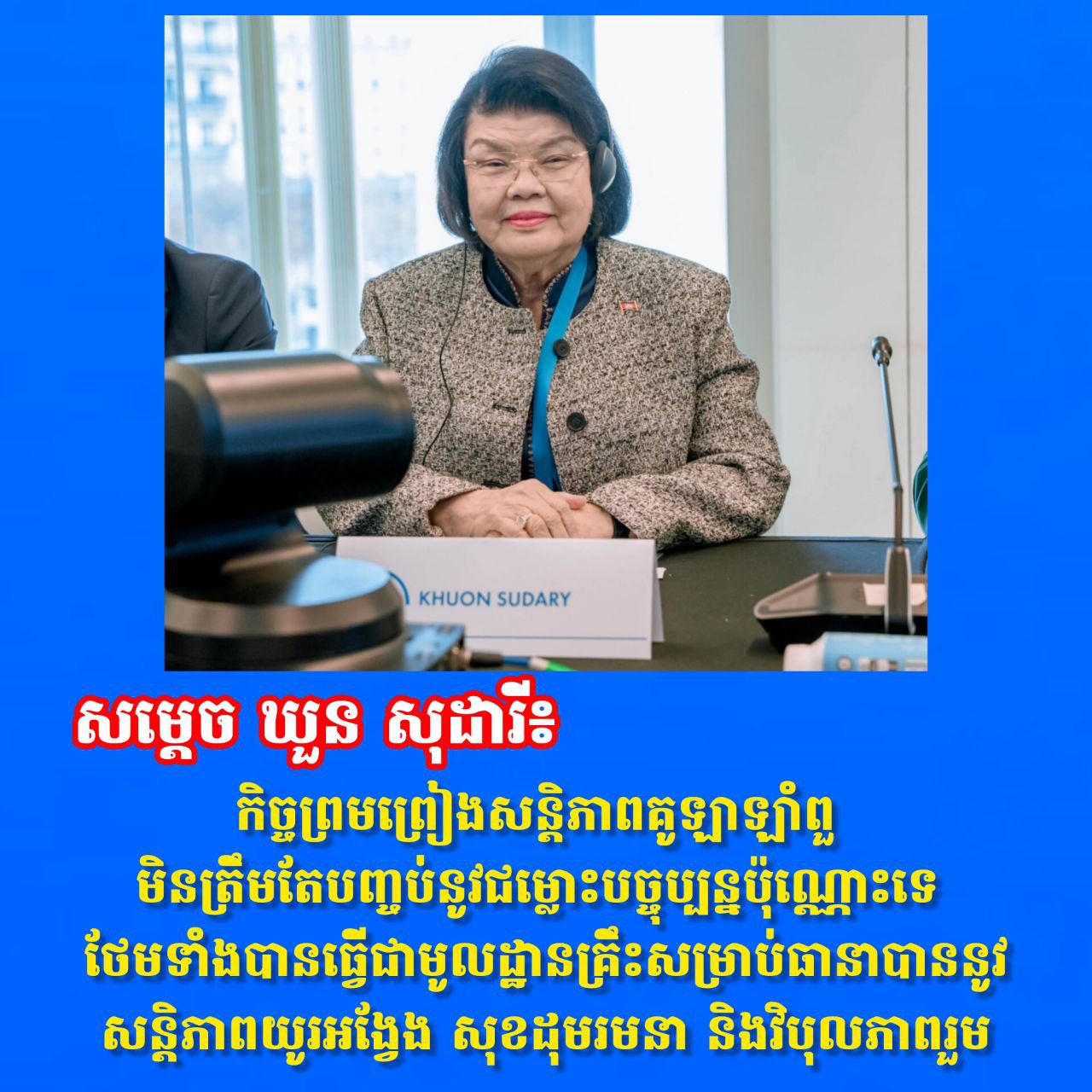 សម្តេច ឃួន សុដារី៖ កិច្ចព្រមព្រៀងសន្តិភាពគូឡាឡាំពួមិនត្រឹមតែបញ្ចប់នូវជម្លោះបច្ចុប្បន្នប៉ុណ្ណោះទេ ថែមទាំងបានធ្វើជាមូលដ្ឋានគ្រឹះសម្រាប់ធានាបាននូវសន្តិភាពយូរអង្វែង សុខដុមរមនា និងវិបុលភាពរួម សម្តេច ឃួន សុដារី៖ កិច្ចព្រមព្រៀងសន្តិភាពគូឡាឡាំពួមិនត្រឹមតែបញ្ចប់នូវជម្លោះបច្ចុប្បន្នប៉ុណ្ណោះទេ ថែមទាំងបានធ្វើជាមូលដ្ឋានគ្រឹះសម្រាប់ធានាបាននូវសន្តិភាពយូរអង្វែង សុខដុមរមនា និងវិបុលភាពរួម