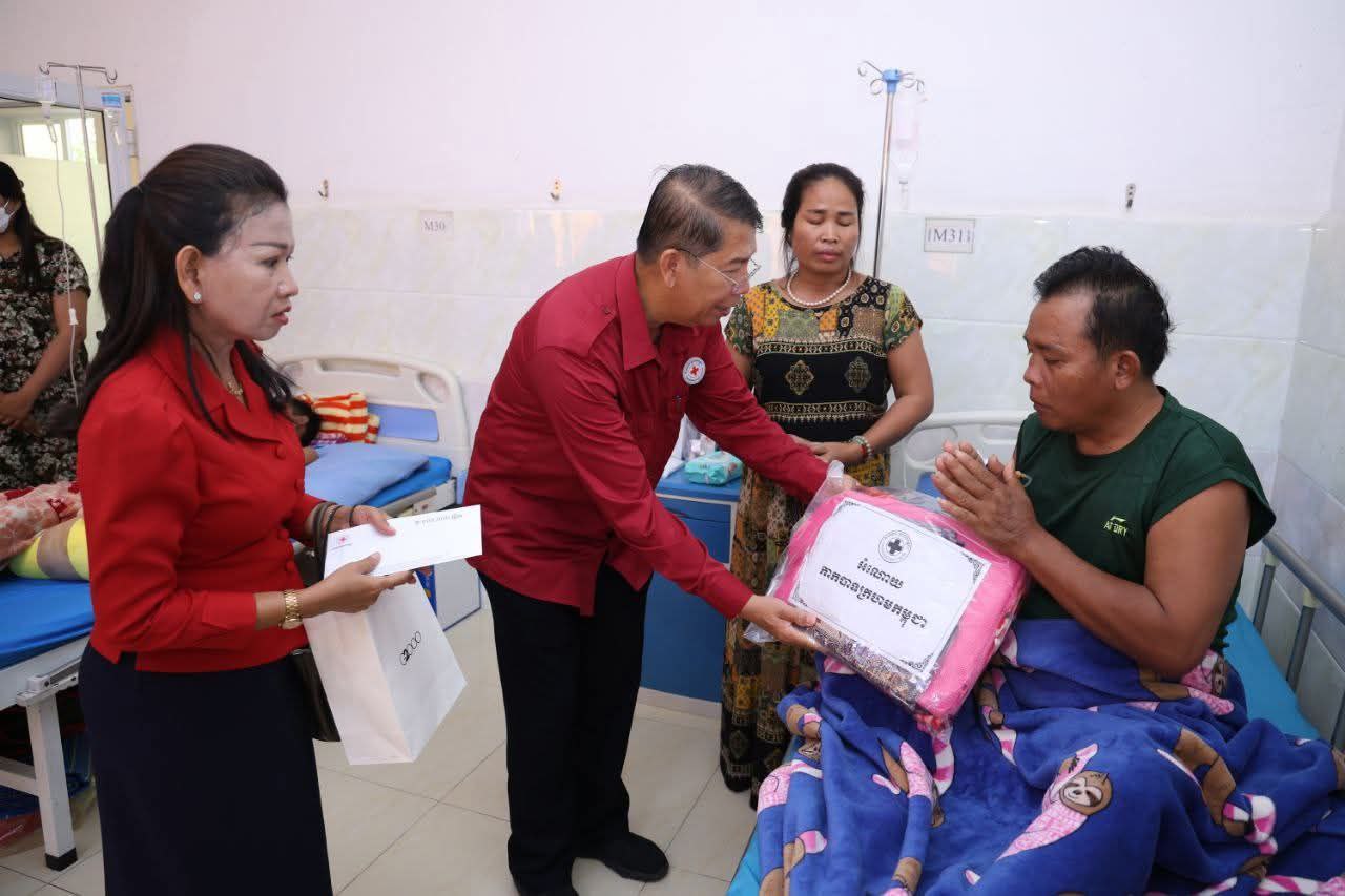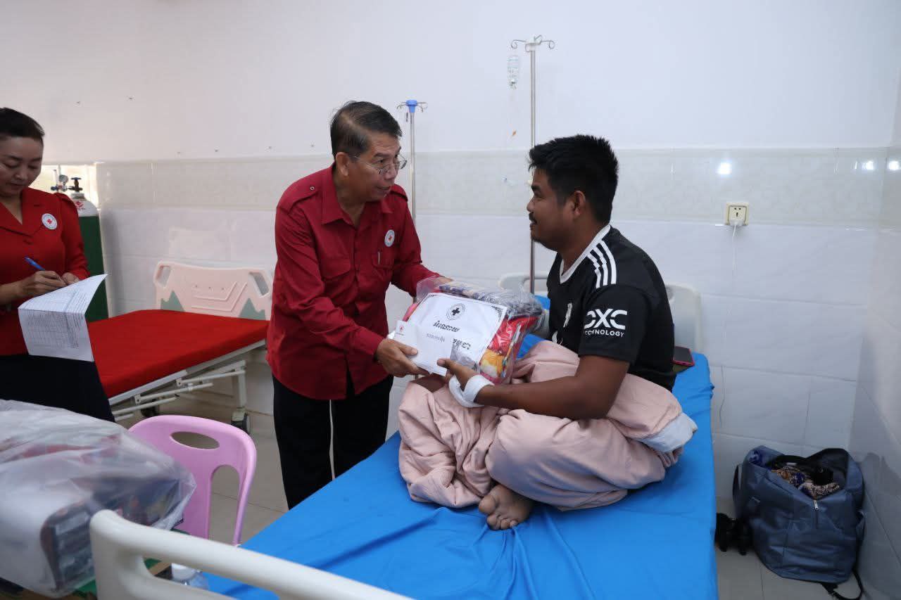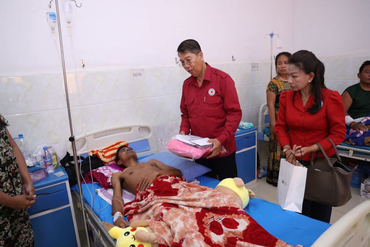 នៅព្រឹកថ្ងៃទី៧ ខែវិច្ឆិកា ឆ្នាំ២០២៥ កាកបាទក្រហមកម្ពុជា ក្រោមម្លប់ដ៏ឧត្តុង្គឧត្តមនៃ សម្តេចព្រះមហាក្សត្រី នរោត្តម មុនិនាថ សីហនុ ព្រះវររាជមាតាជាតិខ្មែរ គង់ប្រថាប់ជាព្រះប្រធានកិត្តិយស និងមានសម្តេចកិត្តិព្រឹទ្ធបណ្ឌិត ប៊ុន រ៉ានី ហ៊ុនសែន ជាប្រធាន បានចាត់ឯកឧត្តម យូ ឡាណា អគ្គលេខាធិការរងទី២ កាកបាទក្រហមកម្ពុជា និងសហការី អញ្ជើញនាំសួរសុខទុក្ខ និងនាំយកអំណោយជាថវិកា និងសម្ភារៈមួយចំនួនជូនយោធិន ឃួយ ឡាយ រងគ្រោះដោយសារមីន កាលថ្ងៃទី៣០ ខែតុលា ឆ្នាំ២០២៥ ដែលកំពុងទទួលការព្យាបាល នៅតាមមន្ទីរពេទ្យក្នុងរាជធានីភ្នំពេញ។