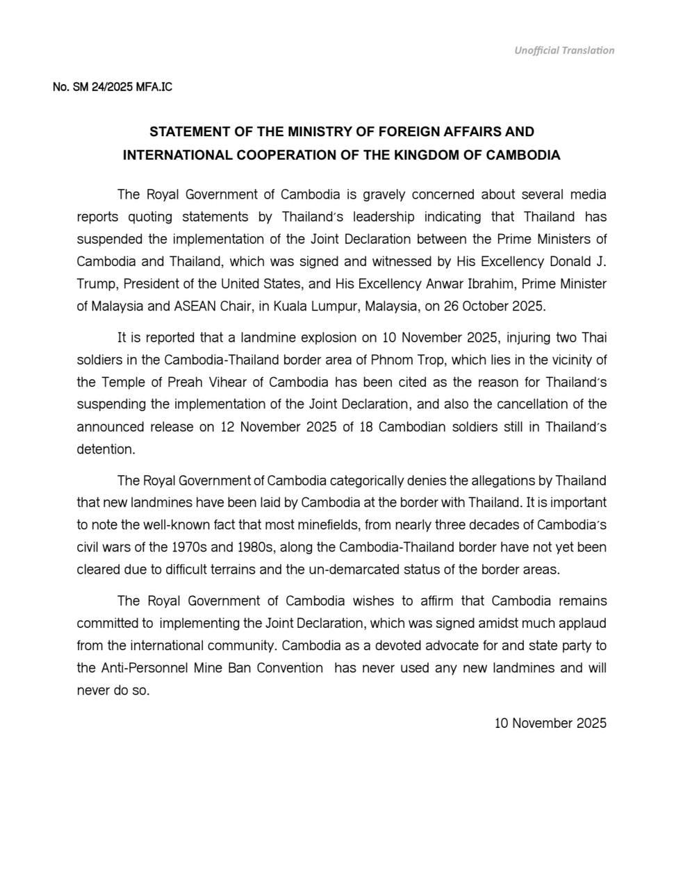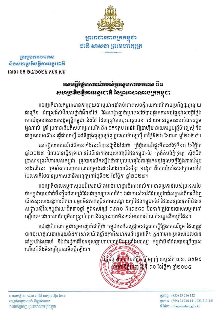 បើតាមសេចក្ដីប្រកាសព័ត៌មានរបស់ក្រសួងការបរទេសនិងសហប្រតិបត្តិការអន្តរជាតិ និង ក្រសួងការពារជាតិ របស់កម្ពុជា កម្ពុជាបានបដិសេធយ៉ាងដាច់អហង្ការនូវការចោទប្រកាន់នេះ ដោយបានហៅថា ជាការចោទប្រកាន់មិនមានមូលដ្ឋាន និងជាការយកលេសដើម្បីផ្អាកអនុវត្តសេចក្ដីថ្លែងការណ៍រួមរវាងប្រទេសទាំងពីរ ជាពិសេសគឺដើម្បីលុបចោលគម្រោងដោះលែងយោធិនខ្មែរ ១៨រូប ដែលភាគីថៃបានប្រកាសថានឹងដោះលែងនៅថ្ងៃទី១២ ខែវិច្ឆិកា ឆ្នាំ២០២៥ ស្អែកនេះ។