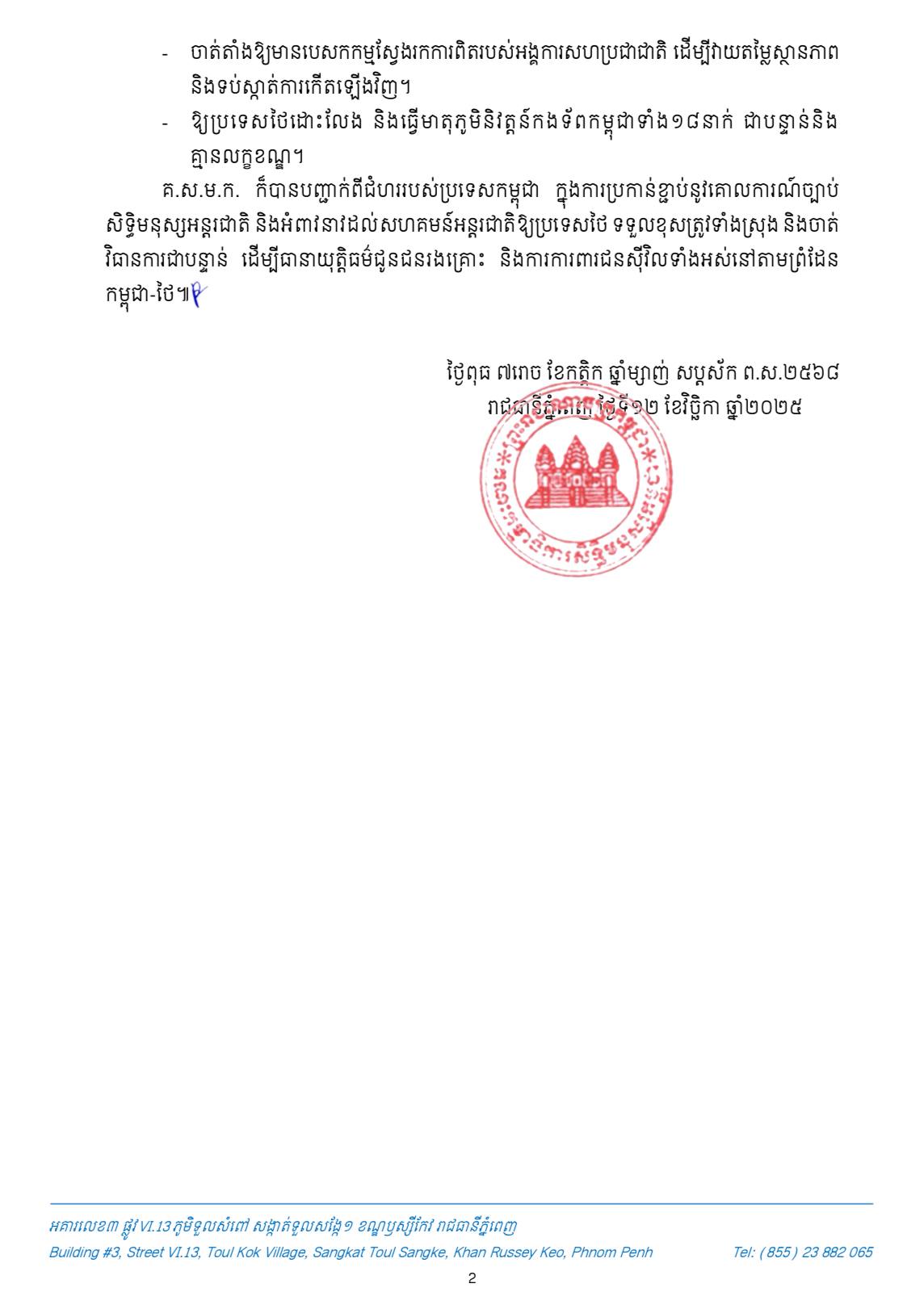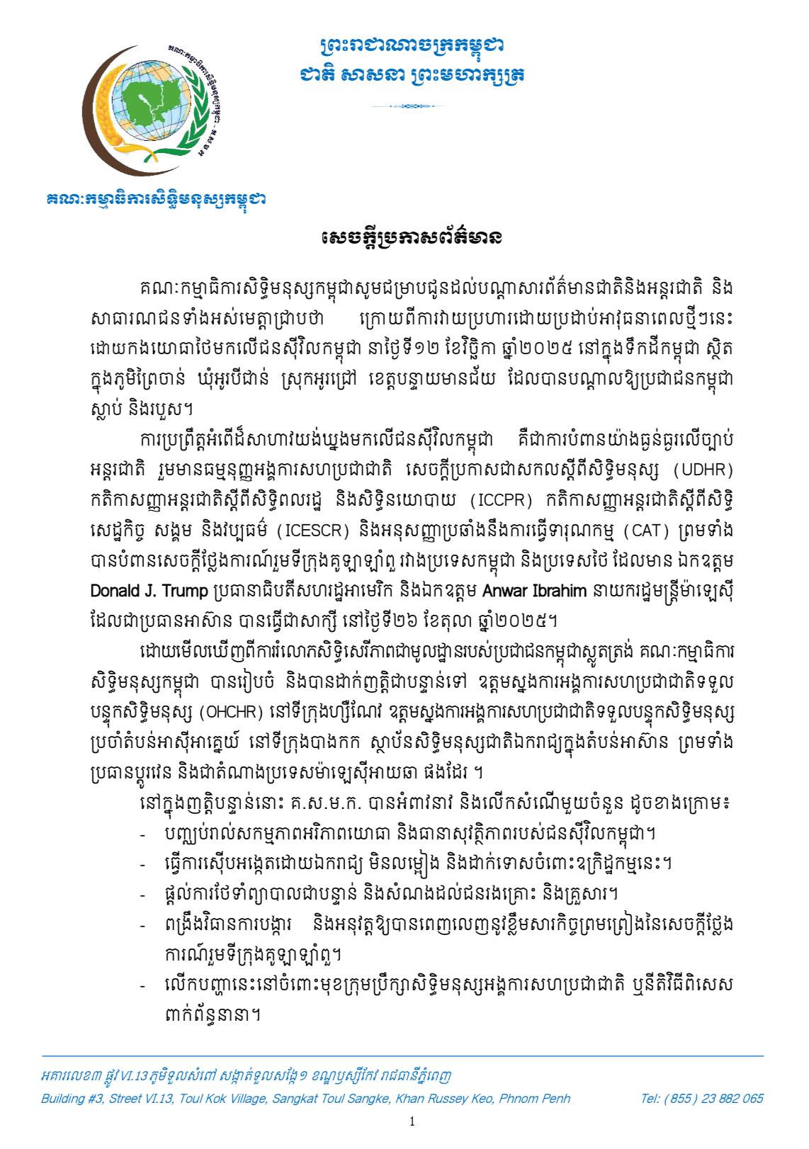 គណៈកម្មាធិការសិទ្ធិមនុស្សកម្ពុជា បានចេញសេចក្តីប្រកាសព័ត៌មានមួយ ចំពោះការវាយប្រហារដោយប្រដាប់អាវុធដោយកងយោធាថៃមកលើជនស៊ីវិលកម្ពុជានាថ្ងៃទី១២ ខែវិច្ឆិកា ឆ្នាំ២០២៥ នៅក្នុងទឹកដីកម្ពុជា ស្ថិតក្នុងភូមិព្រៃចាន់ ឃុំអូរបីជាន់ ស្រុកអូរជ្រៅ ខេត្តបន្ទាយមានជ័យដែលបណ្តាលឱ្យប្រជាជនកម្ពុជាស្លាប់និងរបួស។