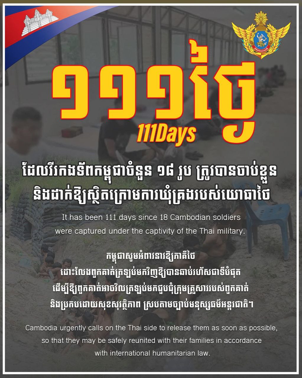 It has been 111days since 18 Cambodian soldiers were captured under the captivity of the Thai military. Cambodia urgently calls on the Thai side to release them as soon as possible, so that they may be safely reunited with their families in accordance with international humanitarian law.