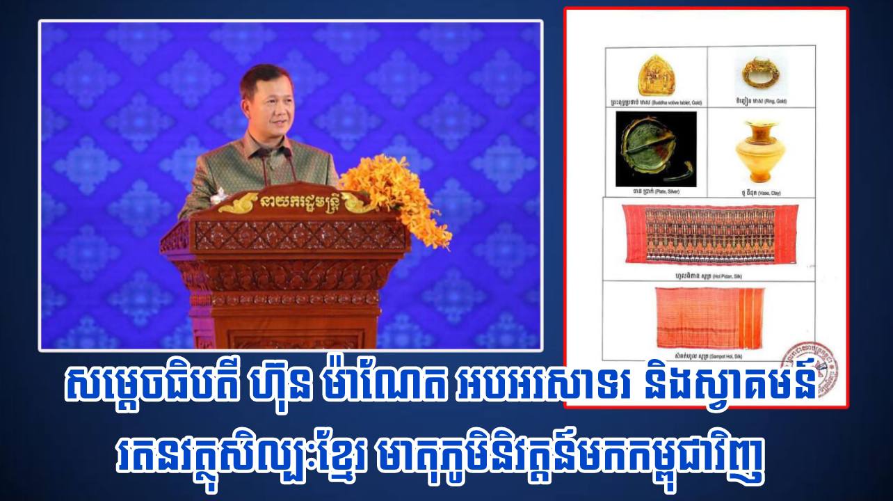 សម្ដេចធិបតី ហ៊ុន ម៉ាណែត អបអរសាទរ និងស្វាគមន៍រតនវត្ថុសិល្បៈខ្មែរ មាតុភូមិនិវត្តន៍មកកម្ពុជាវិញ