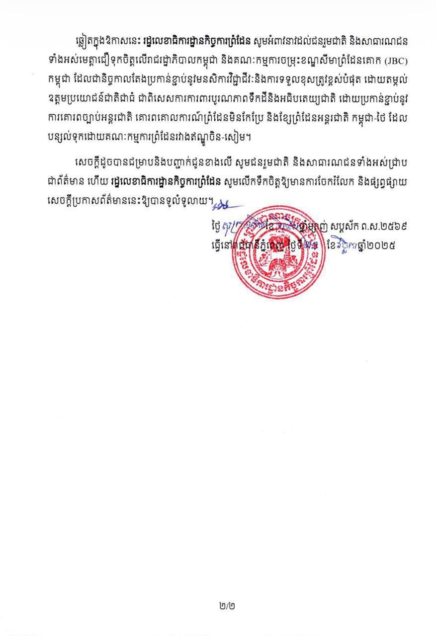 មន្ត្រីជាន់ខ្ពស់នៃរដ្ឋលេខាធិការដ្ឋានកិច្ចការព្រំដែន បានអំពាវនាវដល់សាធារណជនជឿទុកចិត្តលើរាជរដ្ឋាភិបាលកម្ពុជា និងគណៈកម្មការចម្រុះខណ្ឌសីមា ព្រំដែនគោក (JBC) កម្ពុជា ដែល ជានិច្ចកាលតែងប្រកាន់ខ្ជាប់នូវមនសិការវិជ្ជាជីវៈ និងការទទួលខុសត្រូវខ្ពស់បំផុត ដោយតម្កល់ ឧត្តមប្រយោជន៍ជាតិជាធំ ជាពិសេសការការពារបូរណភាពទឹកដីនិងអធិបតេយ្យជាតិ ដោយ ប្រកាន់ខ្ជាប់ នូវ ការ គោរពច្បាប់អន្តរជាតិ គោរពគោលការណ៍ ព្រំដែនមិនកែប្រែ និងខ្សែព្រំដែនអន្តរជាតិ កម្ពុជា-ថៃ ដែល បន្សល់ទុក ដោយ គណៈកម្មការព្រំដែនរវាង ឥណ្ឌូចិន – សៀម និងកុំជឿលើការញុះញ់ង និងការផ្សាយព័ត៌មានមិនពិតរបស់ក្រុមប្រឆាំង។