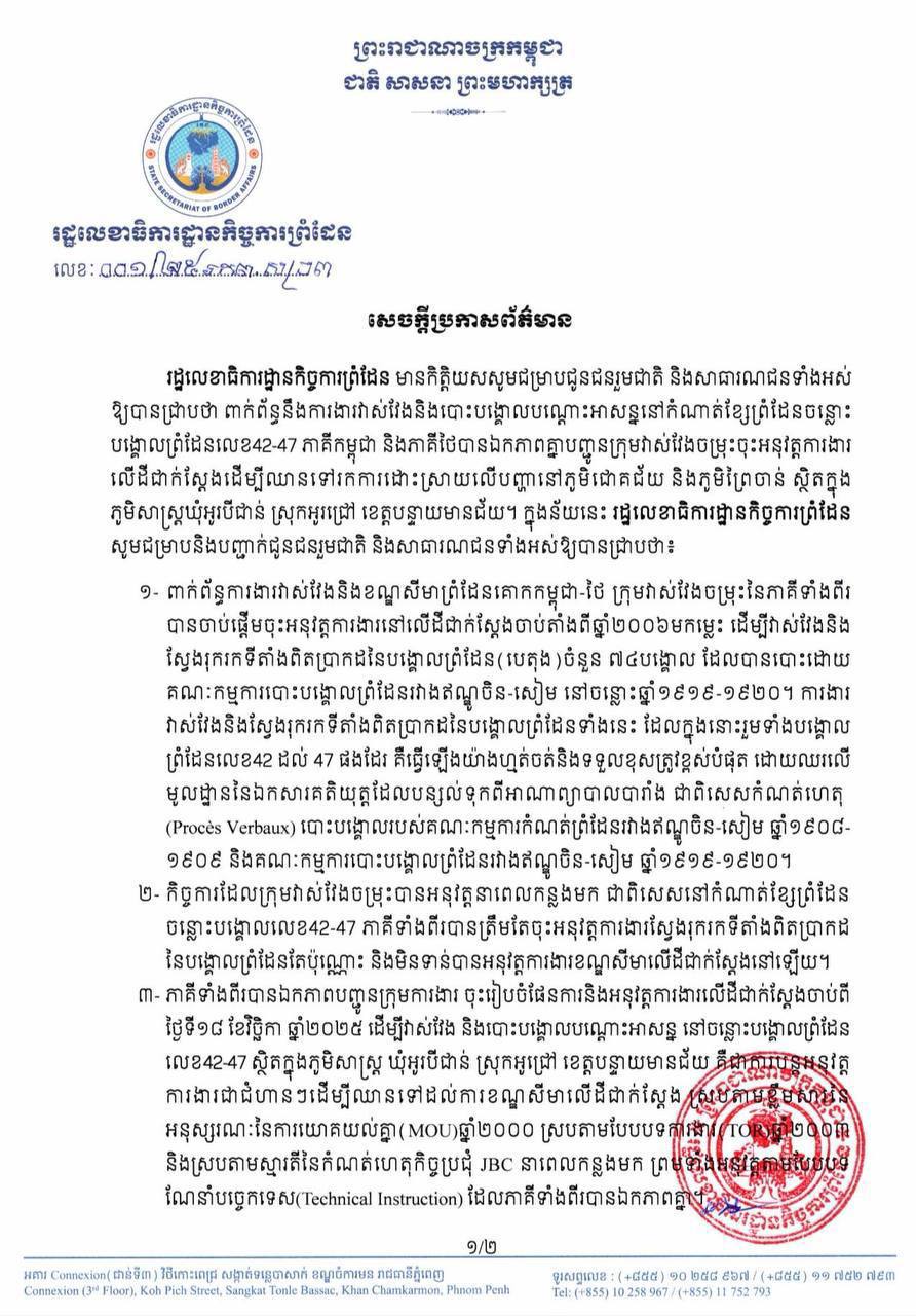 មន្ត្រីនៃរដ្ឋលេខាធិការដ្ឋានកិច្ចការព្រំដែនបានថ្លែងថា ការងារវាស់វែង និងស្វែងរុករកទីតាំងពិតប្រាកដនៃបង្គោលព្រំដែនទាំងនេះដែលក្នុង នោះរួមទាំងបង្គោលព្រំដែនលេខ៤២ ដល់ ៤៧ ផងដែរ គឺធ្វើឡើងយ៉ាងហ្មត់ចត់ និងទទួលខុសត្រូវខ្ពស់បំផុតដោយឈរលើមូលដ្ឋាននៃឯកសារគតិយុត្តដែលបន្សល់ទុកពីអាណាព្យាបាលបារាំង ជាពិសេសកំណត់ហេតុ (Procès Verbaux) បោះ បង្គោល របស់គណៈកម្មការកំណត់ព្រំដែនរវាងឥណ្ឌូចិន-សៀម ឆ្នាំ១៩០៨- ១៩០៩ និងគណៈកម្ម ការ បោះបង្គោលព្រំដែនរវាងឥណ្ឌូចិន-សៀម ឆ្នាំ១៩១៩-១៩២០។ ដូច្នេះក្រុមប្រឆាំងនៅក្រៅស្រុកដែលបង្កើតព័ត៌មានក្លែងក្លាយ និងការផ្សព្វផ្សាយព័ត៌មានមិនពិត ញុះញង់ គឺដើម្បីរុញឱ្យខ្លោចរោយឱ្យឆៅលើបញ្ហាព្រំដែនតែប៉ុណ្ណោះ។