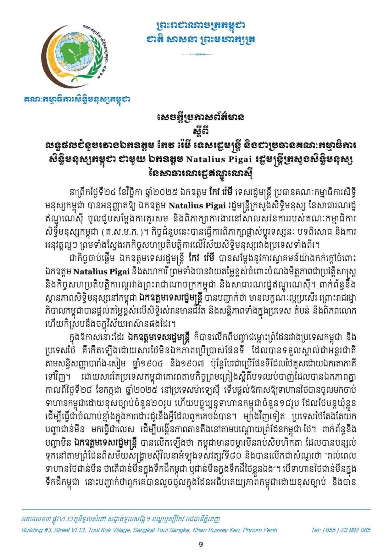 យោងតាមសេចក្តីប្រកាសព័ត៌មានរបស់គណៈកម្មាធិការសិទ្ធិមនុស្សនៅថ្ងៃទី២៤ ខែវិច្ឆិកា ឆ្នាំ២០២៥ ឯកឧត្តម កែវ រ៉េមី ទេសរដ្ឋមន្ត្រី ប្រធានគណៈកម្មាធិការសិទ្ធិមនុស្សកម្ពុជា បានលើកឡើងពីបញ្ហាជម្លោះព្រំដែនរវាងប្រទេសកម្ពុជា និង ប្រទេសថៃ គឺកើតឡើងដោយសារថៃមិនឯកភាពប្រើប្រាស់ផែនទី ដែលបានទទួលស្គាល់ជាអន្តរជាតិ តាមសន្ធិសញ្ញាបារាំង-សៀម ឆ្នាំ១៩០៤ និង១៩០៧ ប៉ុន្តែបែរជាប្រើផែនទីដែលថៃគូសដោយឯកតោភាគី ទៅវិញ។ ដោយសារតែប្រទេសកម្ពុជាគោរពតាមកិច្ចព្រមព្រៀងស្តីពីបទឈប់បាញ់ដែលបានឯកភាពគ្នា កាលពីថ្ងៃទី២៨ ខែកក្កដា ឆ្នាំ២០២៥ នៅប្រទេសម៉ាឡេស៊ី ទើបផ្តល់ឱកាសឱ្យទាហានថៃបានចូលមកចាប់ ទាហានកម្ពុជាដោយខុសច្បាប់ចំនួន២០រូប ហើយបច្ចុប្បន្នទាហានកម្ពុជាចំនួន១៨រូប ដែលថៃបន្តឃុំខ្លួន ដើម្បីធ្វើជាចំណាប់ខ្មាំងក្នុងការដោះដូរនឹងអ្វីដែលពួកគេចង់បាន។