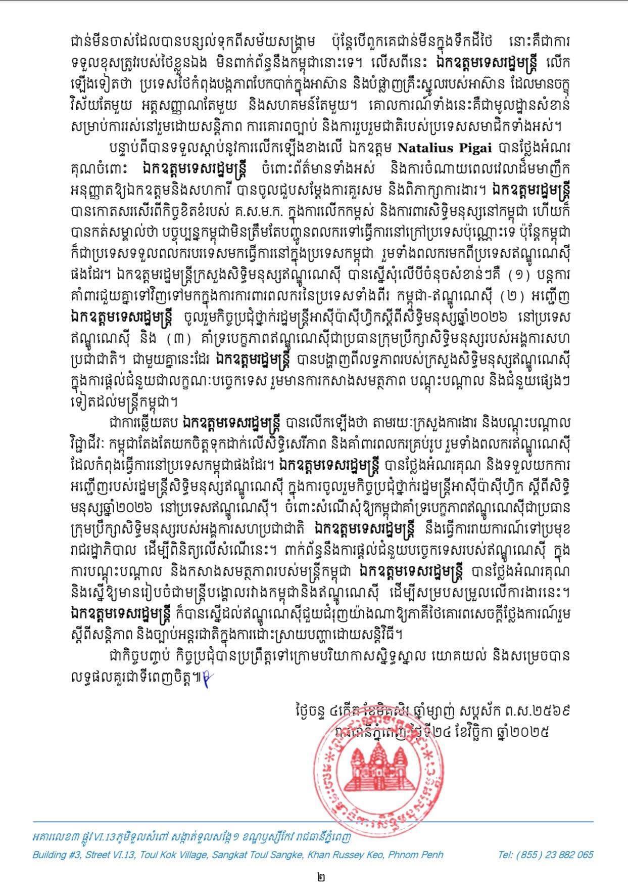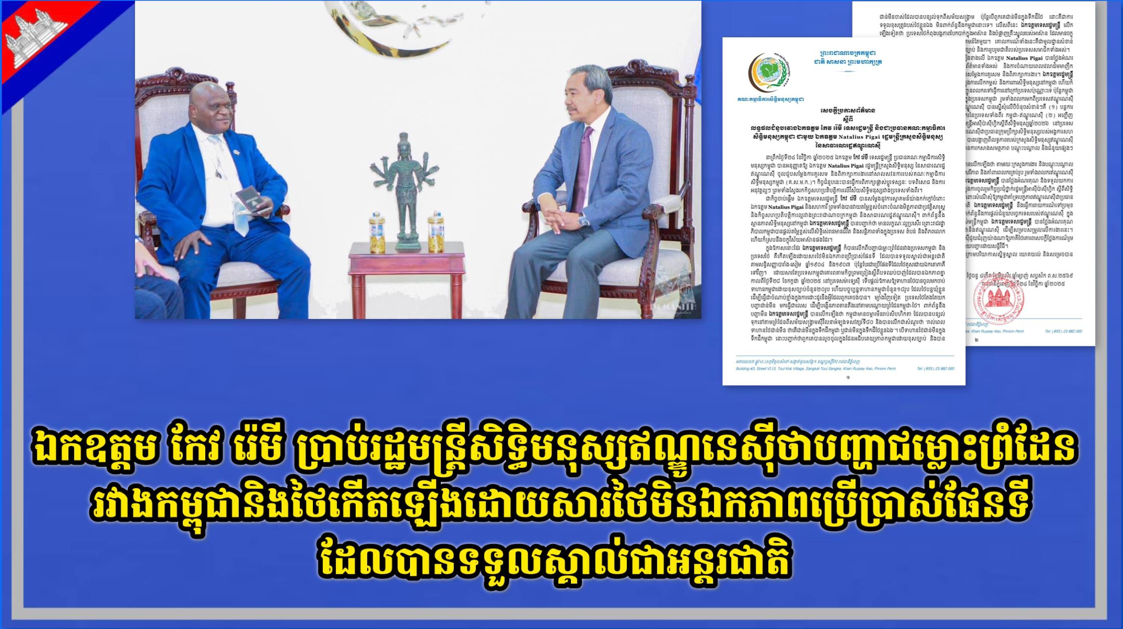 ឯកឧត្តម កែវ រ៉េមី ប្រាប់រដ្ឋមន្រ្តីសិទ្ធិមនុស្សឥណ្ឌូនេស៊ីថា បញ្ហាជម្លោះព្រំដែនរវាងកម្ពុជានិងថៃកើតឡើងដោយសារថៃមិនឯកភាពប្រើប្រាស់ផែនទីដែលបានទទួលស្គាល់ជាអន្តរជាតិ