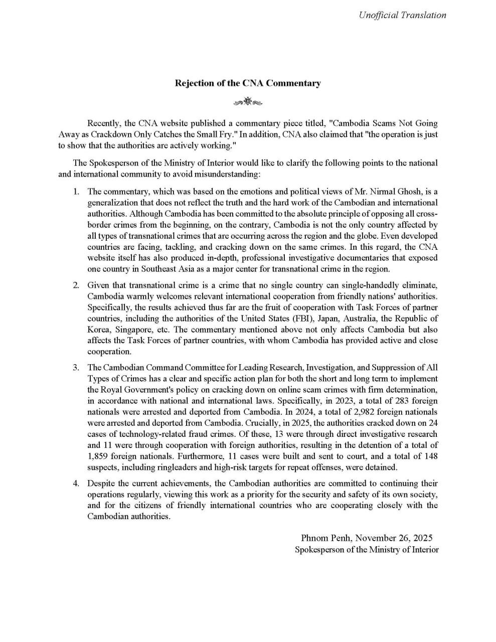 ឆ្លើយតបនឹងការផ្សព្វផ្សាយបំភ្លៃការពិតនេះ អ្នកនាំពាក្យក្រសួងមហាផ្ទៃ នៅថ្ងៃទី២៦ ខែវិច្ឆិកា ឆ្នាំ២០២៥នេះ បានចេញសេចក្តីច្រានចោលបទអត្ថាធិប្បាយរបស់គេហទំព័រ CNA ដោយបំភ្លឺជូនមតិសាធារណជាតិ និងអន្តរជាតិឱ្យបានជ្រាបពីការពិតដើម្បីជៀសវាងការភាន់ច្រឡំ។