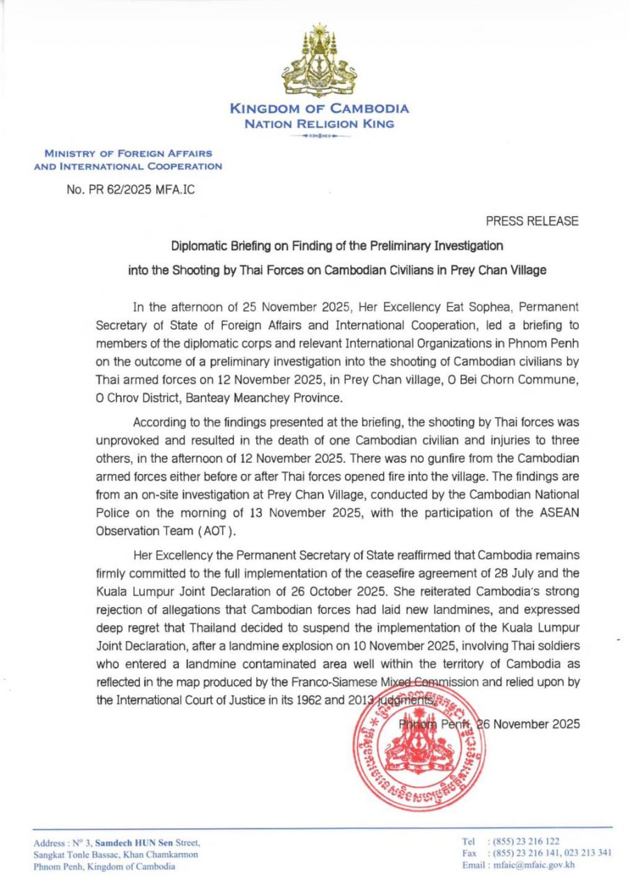 យោងតាមលទ្ធផលនៃការស៊ើបអង្កេតបឋម បានបញ្ជាក់ថា កងកម្លាំងថៃបានការបាញ់ប្រហារមកលើជនស៊ីវិលកម្ពុជា ដោយគ្មានការបង្កហេតុញុះញង់ ហើយបានបណ្តាលឱ្យជនស៊ីវិលកម្ពុជាម្នាក់ស្លាប់ និងបីនាក់ទៀតរងរបួស នៅរសៀលថ្ងៃទី១២ ខែវិច្ឆិកា ឆ្នាំ២០២៥ ហើយក៏ពុំមានការផ្ទុះអាវុធពីសំណាក់កងកម្លាំងកម្ពុជានៅមុន ឬក៏នៅក្រោយពេលដែលកងកម្លាំងថៃបាញ់ប្រហារចូលទៅក្នុងភូមិនេះទេ។ នេះគឺជាលទ្ធផលនៃការស៊ើបអង្កេតនៅទីតាំងកើតហេតុក្នុងភូមិព្រៃចាន់ ដែលអនុវត្តដោយនគរបាលជាតិកម្ពុជា នៅព្រឹកថ្ងៃទី១៣ ខែវិច្ឆិកា ឆ្នាំ២០២៥ ដោយមានការចូលរួមពីក្រុមសង្កេតការណ៍អាស៊ាន (AOT)៕