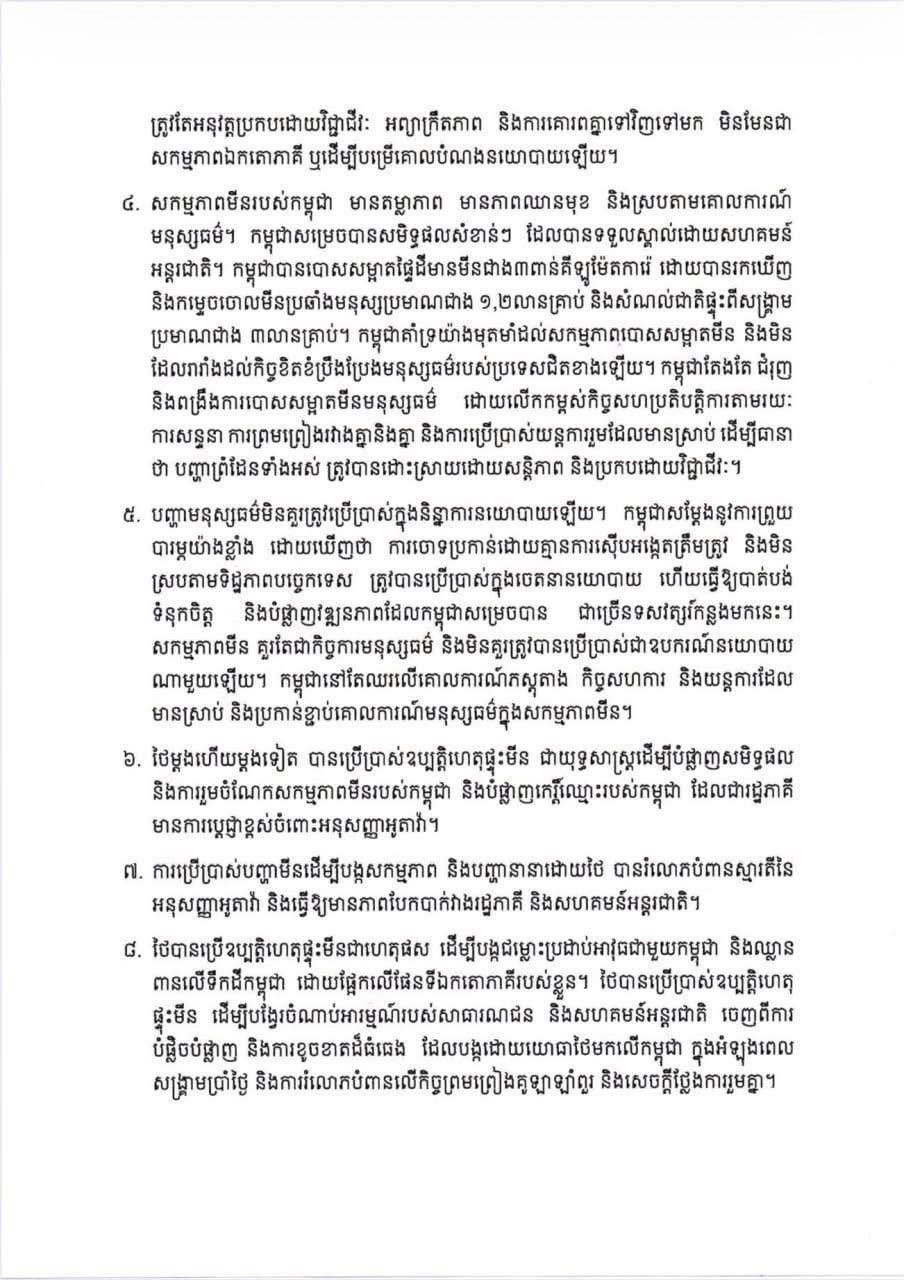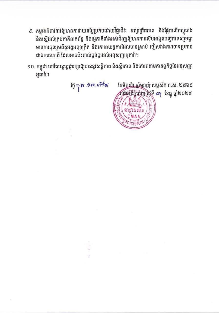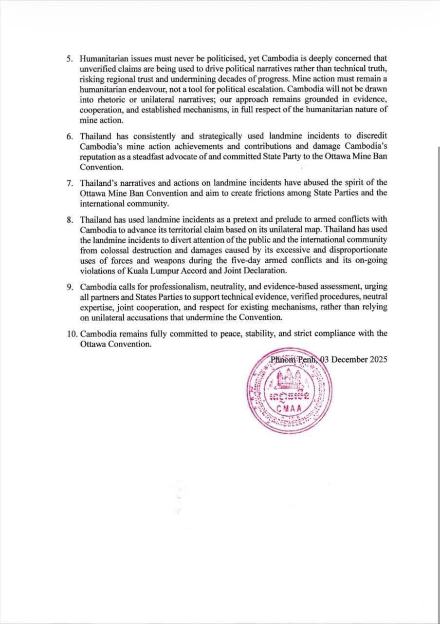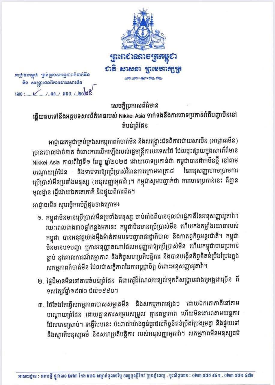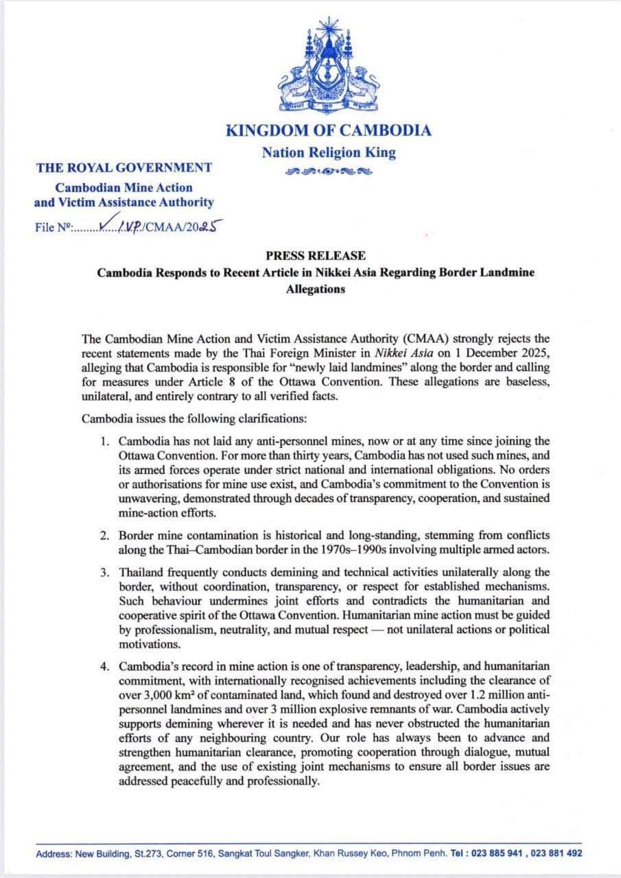 យោងតាមសេចក្តីប្រកាសព័ត៌មានរបស់អាជ្ញាធរកម្ពុជា គ្រប់គ្រងសកម្មភាពកំចាត់មីន និង សង្គ្រោះជនពិការដោយសារមីនដែលឆ្លើយតបទៅនឹងអត្ថបទសារព័ត៌មានរបស់ Nikkei Asia ទាក់ទងនឹងការចោទប្រកាន់អំពីបញ្ហាមីននៅតំបន់ព្រំដែននៅថ្ងៃទី៣ ខែធ្នូ ឆ្នាំ២០២៥ បានឱ្យដឹងថា អាជ្ញាធរកម្ពុជាគ្រប់គ្រងសកម្មភាពកំចាត់មីន និងសង្គ្រោះជនពិការដោយសារមីន (អាជ្ញាធរមីន) ច្រានចោលដាច់ខាត ចំពោះការលើកឡើងរបស់រដ្ឋមន្ត្រីការបរទេសថៃ ដែលចុះផ្សាយក្នុងសារព័ត៌មាន Nikkei Asia កាលពីថ្ងៃទី១ ខែធ្នូ ឆ្នាំ២០២៥ ដោយចោទប្រកាន់ថា កម្ពុជាបានដាក់មីនថ្មី នៅតាមបណ្តោយព្រំដែន និងទាមទារឱ្យប្រើប្រាស់វិធានការក្រោមមាត្រា៨ នៃអនុសញ្ញាហាមប្រាមការប្រើប្រាស់មីនប្រឆាំងមនុស្ស (អនុសញ្ញាអូតាវ៉ា)។ កម្ពុជាសូមបញ្ជាក់ថា ការចោទប្រកាន់នេះ គឺគ្មាន មូលដ្ឋាន ធ្វើដោយឯកតោភាគី និងផ្ទុយពីការពិត។