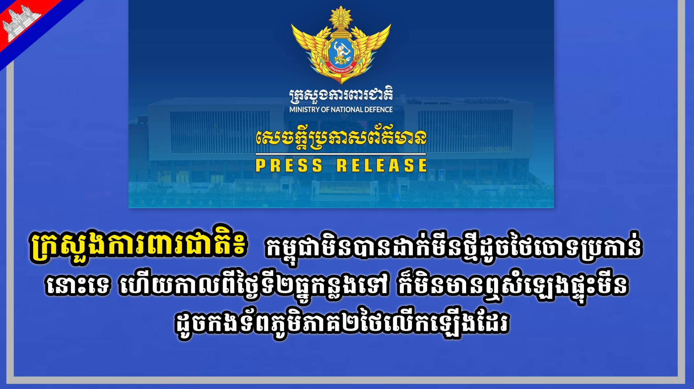 ក្រសួងការពារជាតិ សូមបញ្ជាក់យ៉ាងមុតមាំសាជាថ្មីថា ចាប់តាំងពីក្លាយជារដ្ឋភាគីនៃអនុសញ្ញាអូតាវ៉ា កម្ពុជាតែងតែប្រកាន់ខ្ជាប់នូវគោលការណ៍ និងកាតព្វកិច្ចរបស់ខ្លួននៅក្រោមច្បាប់អន្តរជាតិ ដោយមិនដែលដាក់មីនថ្មីដែលគំរាមកំហែងដល់សន្តិសុខ និងសុវត្ថិភាពរបស់មនុស្សជាតិនោះឡើយ។ កម្ពុជាក៏សូមអំពាវនាវឱ្យភាគីថៃបញ្ឈប់ជាបន្ទាន់ការយកបញ្ហាមីនដែលជាព័ត៌មានមិនពិត ដើម្បីធ្វើជាលេសរំលោភបំពានមកលើដែនអធិបតេយ្យស្របច្បាប់របស់កម្ពុជា។