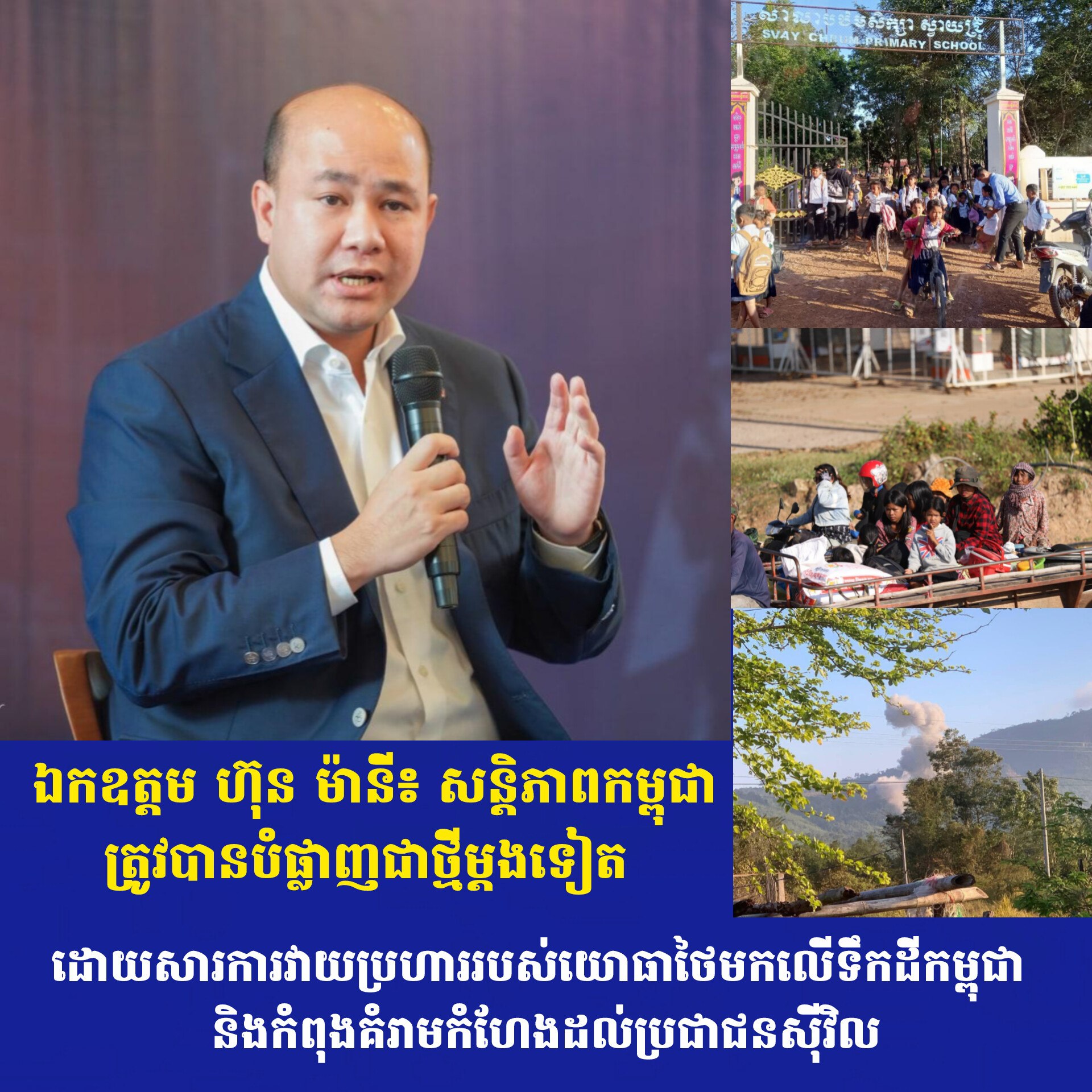 ឯកឧត្តម ហ៊ុន ម៉ានី៖ សន្តិភាពកម្ពុជាត្រូវបានបំផ្លាញជាថ្មីម្តងទៀត ដោយសារការវាយប្រហាររបស់យោធាថៃមកលើទឹកដីកម្ពុជានិងកំពុងគំរាមកំហែងដល់ប្រជាជនស៊ីវិល