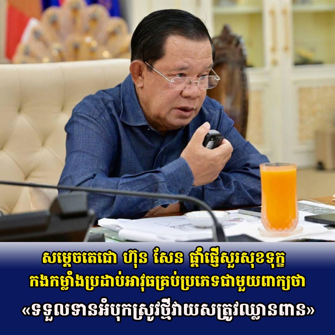 សម្តេចតេជោ ហ៊ុន សែន ផ្តាំផ្ញើសួរសុខទុក្ខកងកម្លាំងប្រដាប់អាវុធគ្រប់ប្រភេទជាមួយពាក្យថា «ទទួលទានអំបុកស្រូវថ្មីវាយសត្រូវឈ្លានពាន» សម្តេចតេជោ ហ៊ុន សែន ផ្តាំផ្ញើសួរសុខទុក្ខកងកម្លាំងប្រដាប់អាវុធគ្រប់ប្រភេទជាមួយពាក្យថា «ទទួលទានអំបុកស្រូវថ្មីវាយសត្រូវឈ្លានពាន»