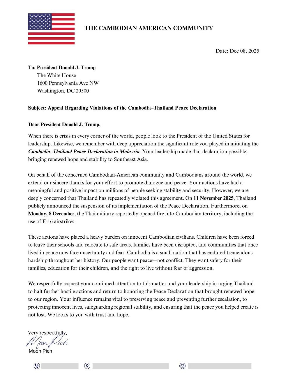 លោក Moon Pich អំពាវនាវដលពលរដ្ឋខ្មែរ-អាមេរិកកាំង បន្តសរសេរលិខិតឬញត្តិដើម្បីជំរុញឱ្យសហរដ្ឋអាមេរិកជួយដោះស្រាយវិបត្តិនិងដាក់សម្ពាធភាគីថៃឱ្យគោរពកិច្ចព្រមព្រៀងសន្តិភាព