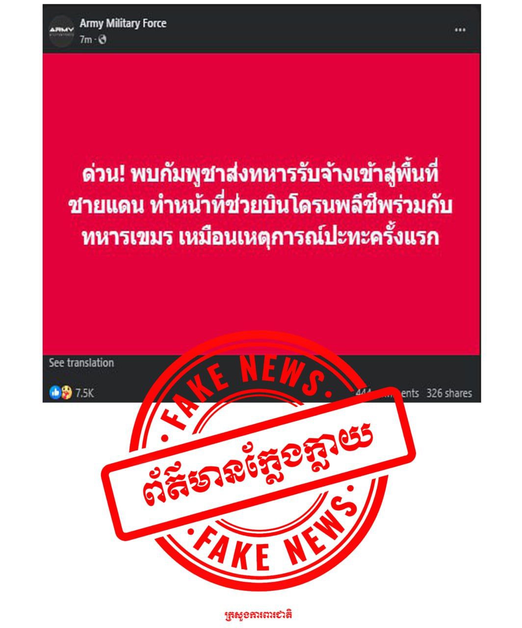 The Ministry of National Defence of Cambodia would like to reject the content published by the Thai Tribune newspaper and the Army Military Force Facebook page, which accused Cambodia of using foreign mercenaries to help launch suicide drones in the Cambodian-Thai border conflict. The Ministry asserts that this information is false, fabricated, and intended only to malign Cambodia.